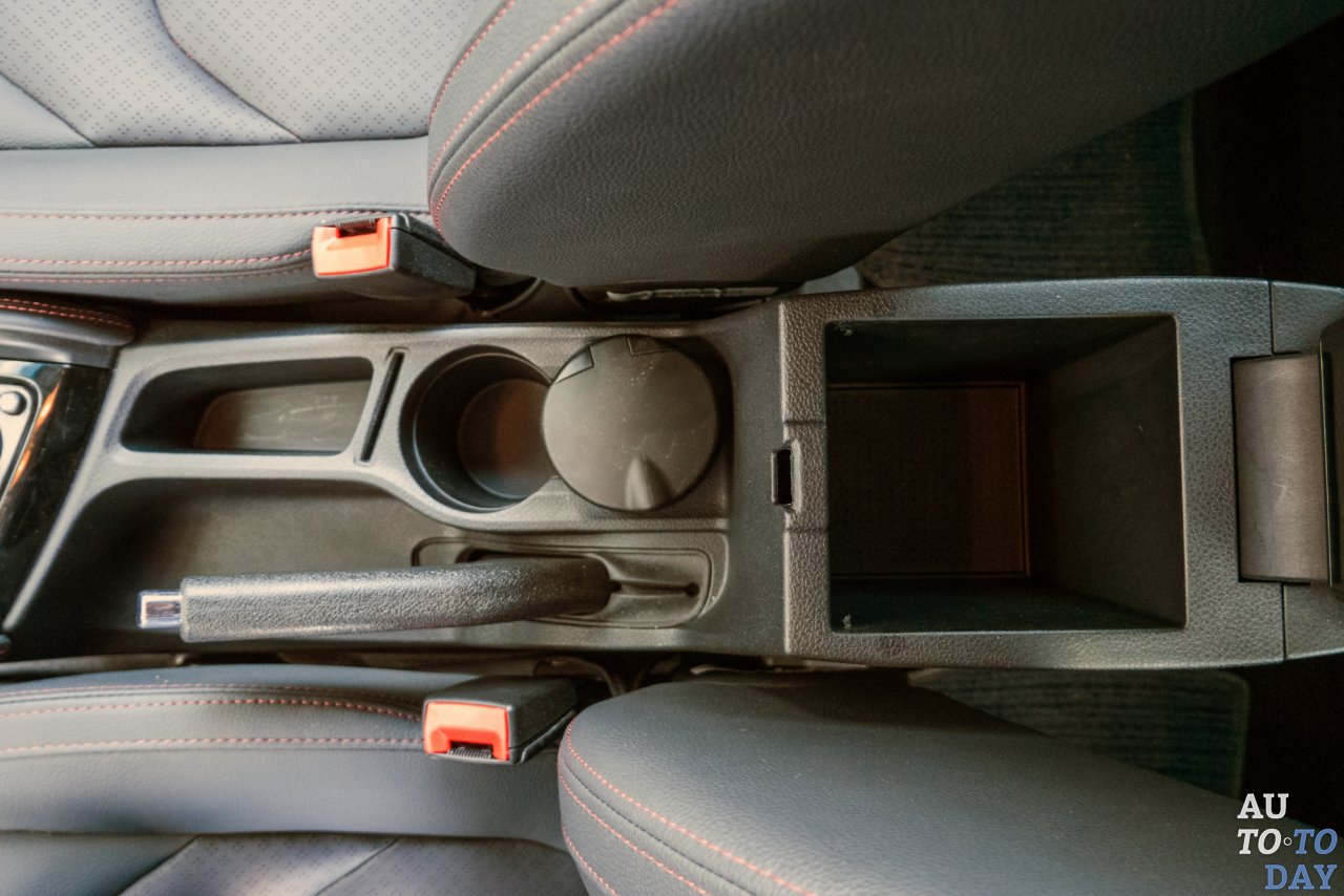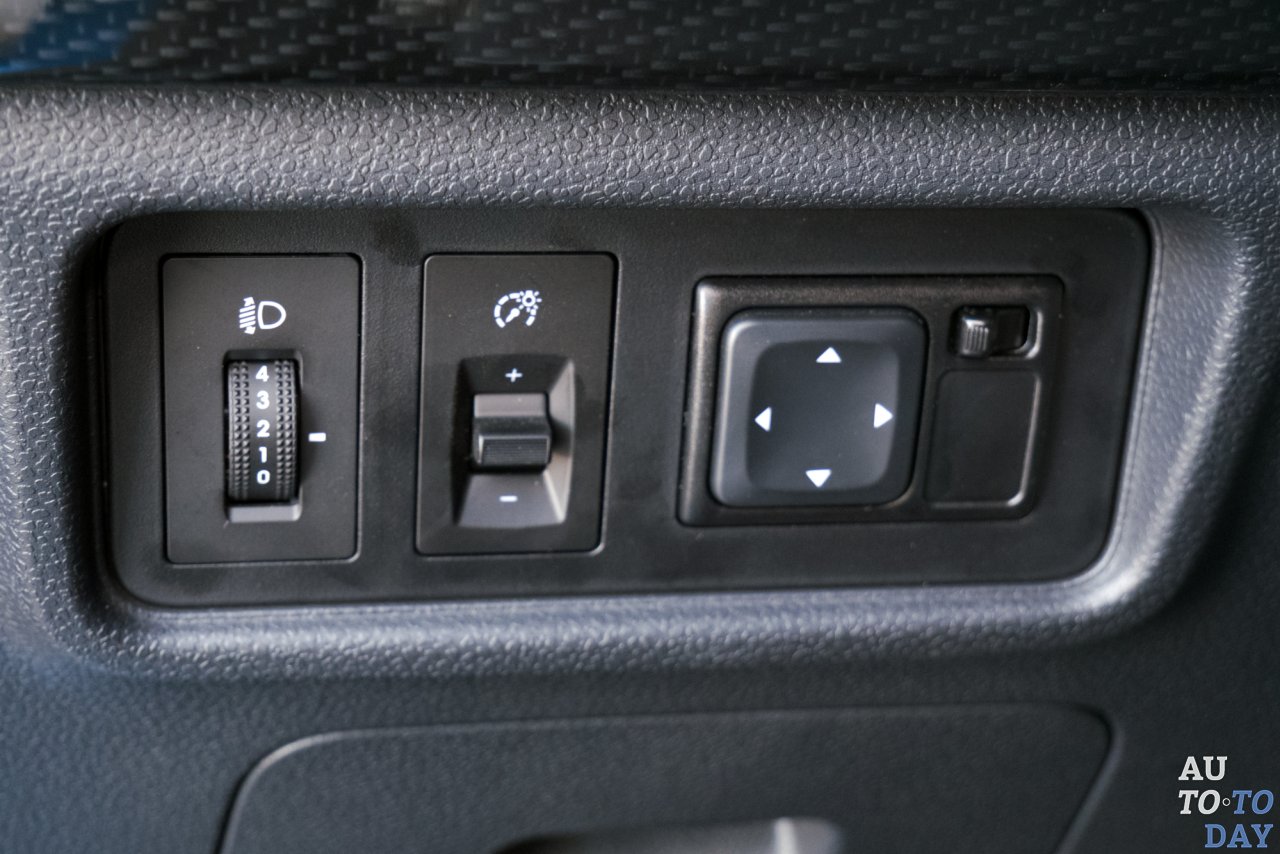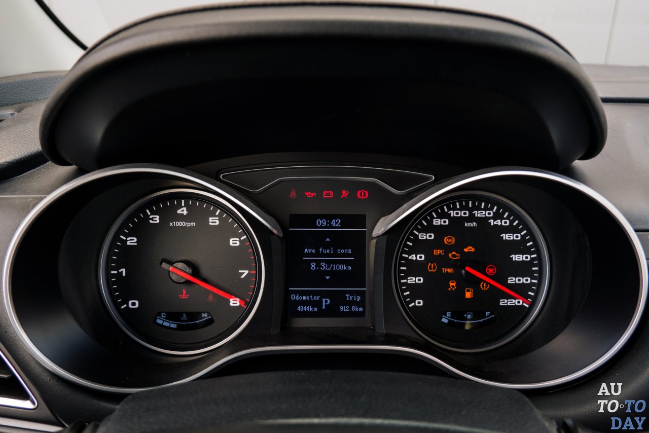 Центральная консоль выполнена преимущественно из твердых сортов пластика, мягкий только козырек над щитком приборов. Но вид и запах у деталей – на должном уровне, даже когда машина постояла на 36-градусном солнцепеке. Щиток приборов с парой аналоговых приборов хорошо читаем благодаря тому, что шрифт циферблатов как две капли воды напоминает один немецкий спортивный бренд. Заимствование считаем удачным. Рулевое колесо по форме удобно, но имеет мелкие эргономические недочеты в вопросе клавиш. Так, кнопки управления громкостью слишком мелкие.