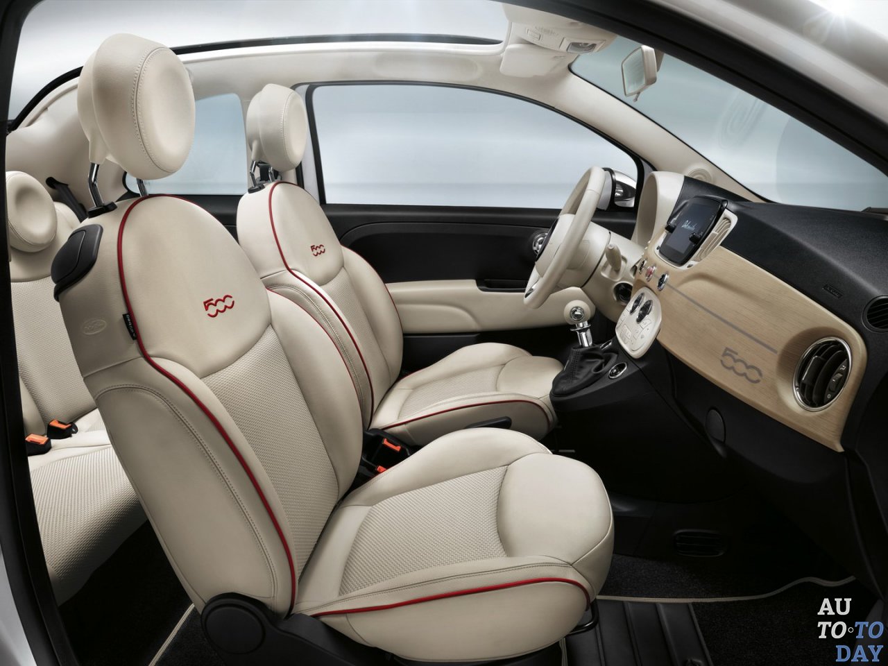 Внутри доминирует светло-коричневая кожа на сидениях с красной окантовкой и красным логотипом 500, вышитым на спинках, а также деревянная отделка на приборной панели, набор специальных ковриков, информационно-развлекательная система, автоматический климат-контроль и многофункциональный руль.