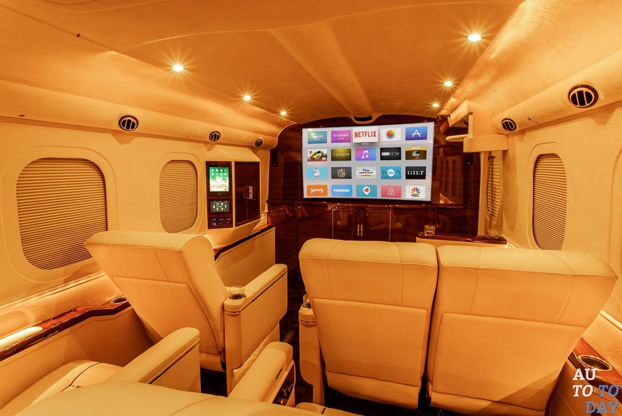 G-77 Sky Master приносит итальянские кожаные сидения с регулировкой, подогревом и массажем, звуковую систему домашнего кинотеатра Bose, подключенную к 65-дюймовому телевизору Curved Ultra HD, Apple iPad для проведения видеоконференций и множество систем безопасности.