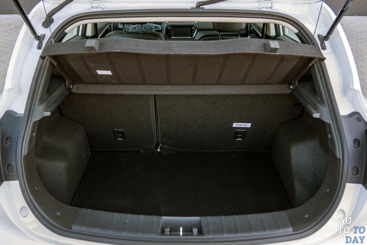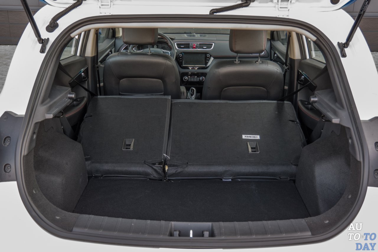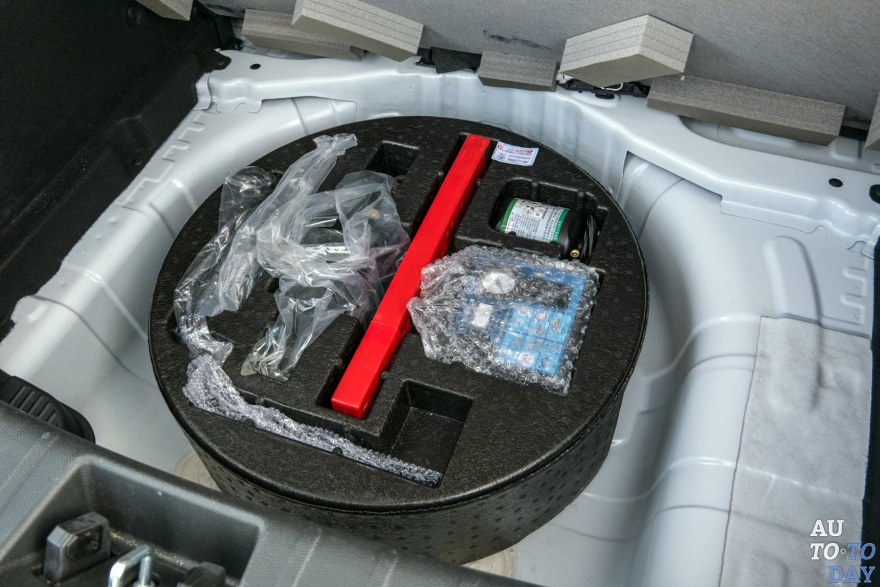 В походном положении объем багажного отсека равен 450 литров – цифра немаленькая. Правда, впечатление несколько портит высокий порог. Под полом пряталось запасное колесо и небольшой органайзер для дорожного инструмента. Если сложить второй ряд, то пространство значительно увеличится, но ровной площадки не получится. Грузоподъемность у кроссовера невелика – всего 375 кг. Виной тому большой вес тяговой аккумуляторной батареи.