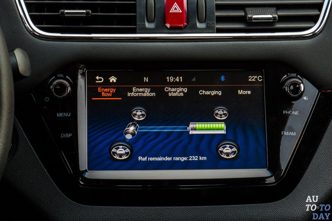 Мультимедийная система с 8-дюймовым сенсорным дисплеем оформлена в стиле «яблочной» операционной системы. Экран неплохо отзывается на нажатия и имеет хорошую контрастность. Главной фишкой инфотеймента можно считать удобный доступ к сервисной «электромобильной» информации касательно запаса хода, скорости зарядки, источниках потребления энергии и пр.