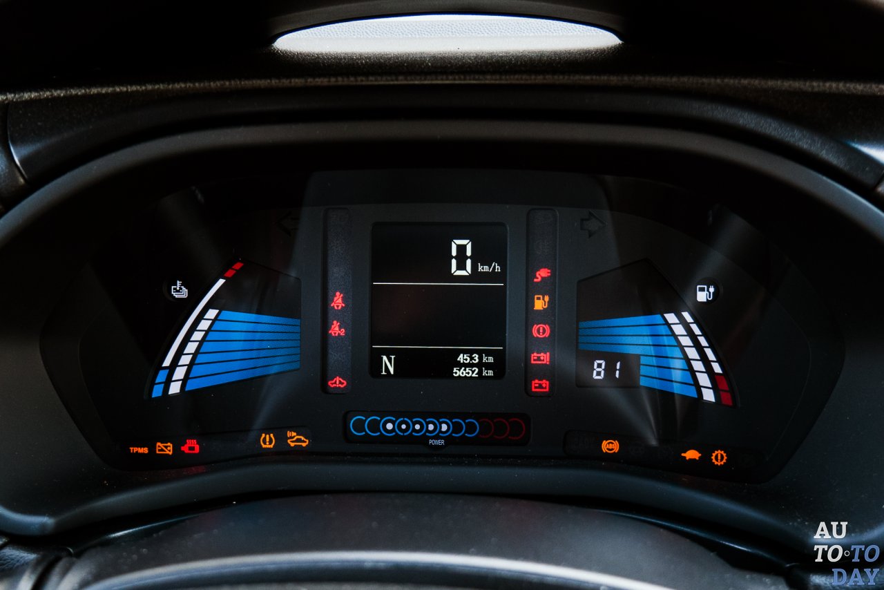 В салоне JAC iEV7S много общего с его бензиновым собратом – та же передняя панель, рулевое колесо. Дверные карты и пр., но многие элементы имеют едва заметные отличия. Так, на щитке приборов в качестве главного индикатора выведен запас хода в «шпалах», как на мобильных телефонах. Мелким шрифтом указан заряд и в процентах. Столь простая графика на деле оказалась очень информативной. Монохромный экран борткомпьютера не только показывает пройденный километраж, но и состояние системы рекуперации.