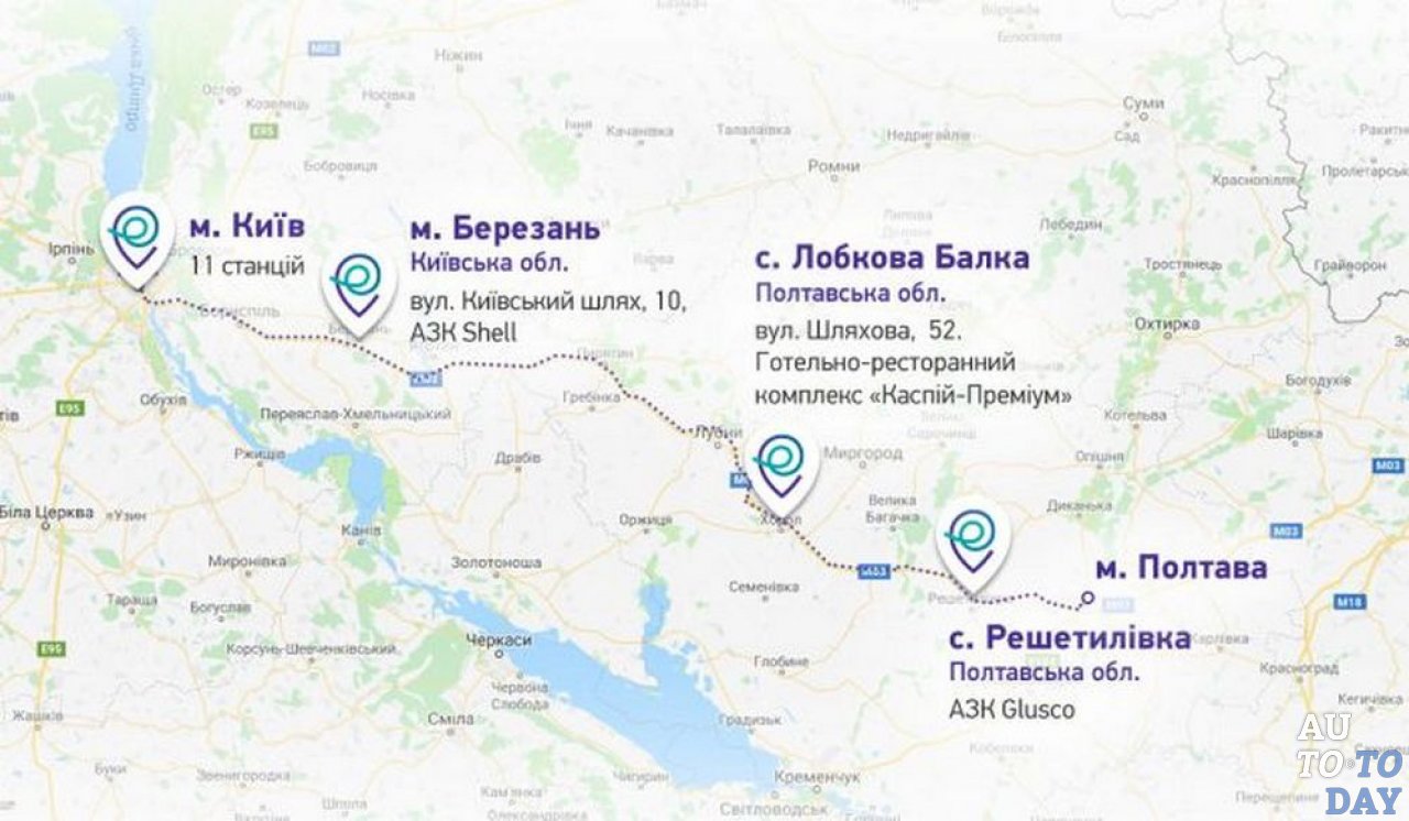 В Киевской области в городе Березань зарядка находиться на автозаправке Shell. В Полтавской области в селе Лобковая Балка зарядить электромобиль можно возле гостиничного комплекса «Каспий-Премиум», в селе Решетиловка – на автозаправке Glusco.