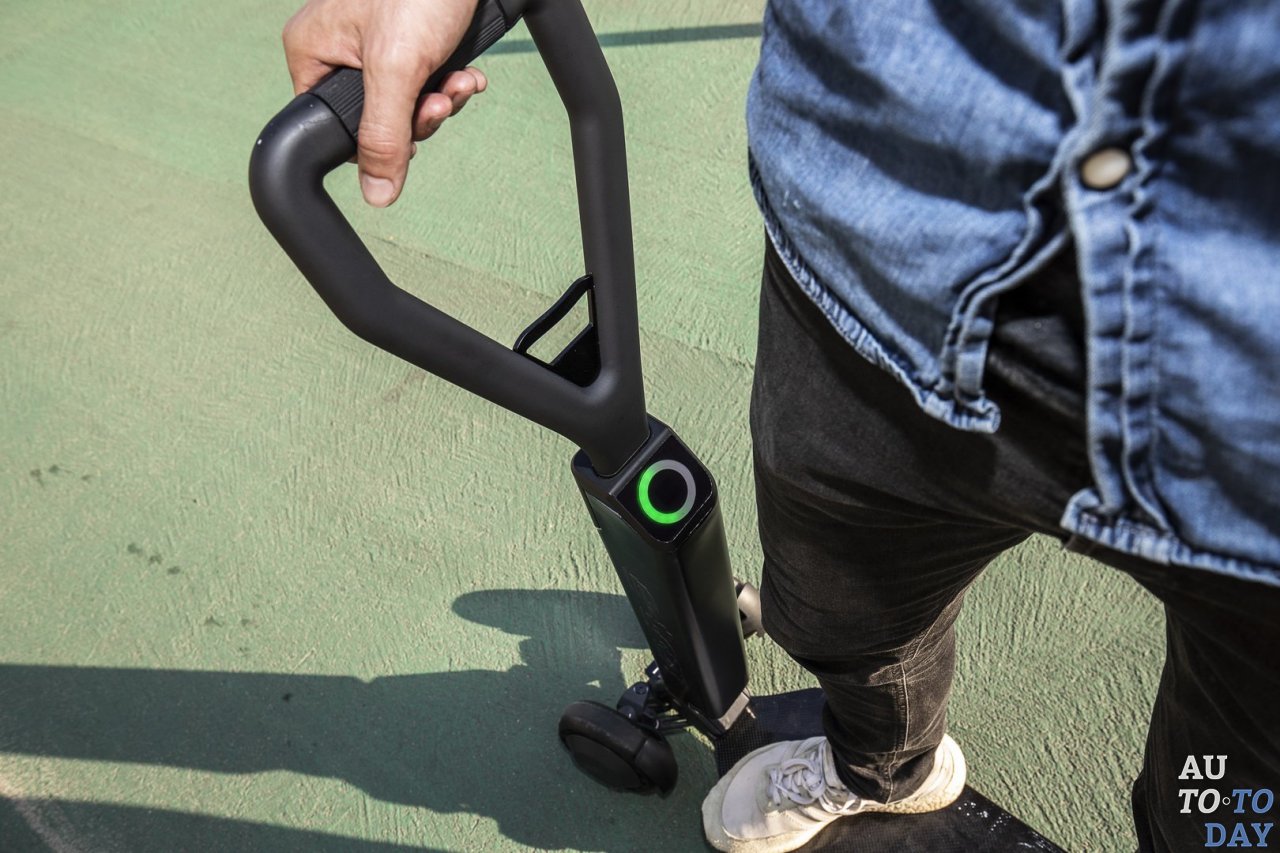 «Несмотря на то, что водители держат одну руку на руле, они управляют самокатом, как скейтбордом, ногами перемещая свой вес. Подвижные оси с четырьмя колесами допускают необычайно крутые повороты. Конечно, E-Tron Scooter также движется прямо вперёд».