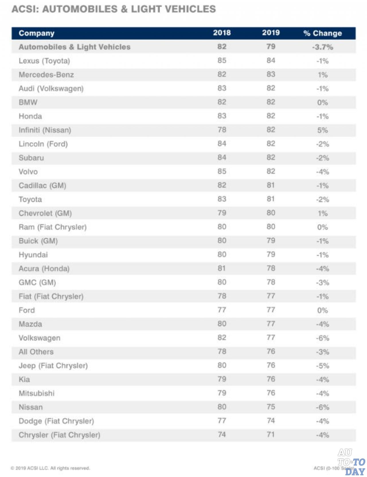 Цифры показали, что потребители стали довольнее продуктами Lexus (бренд набрал 84 балла), оценки которой немного опередили немецкого конкурента Mercedes (83 балла). За ними последовали Audi, BMW, Honda, Infiniti, Lincoln, Subaru и Volvo, получившие на балл меньше.