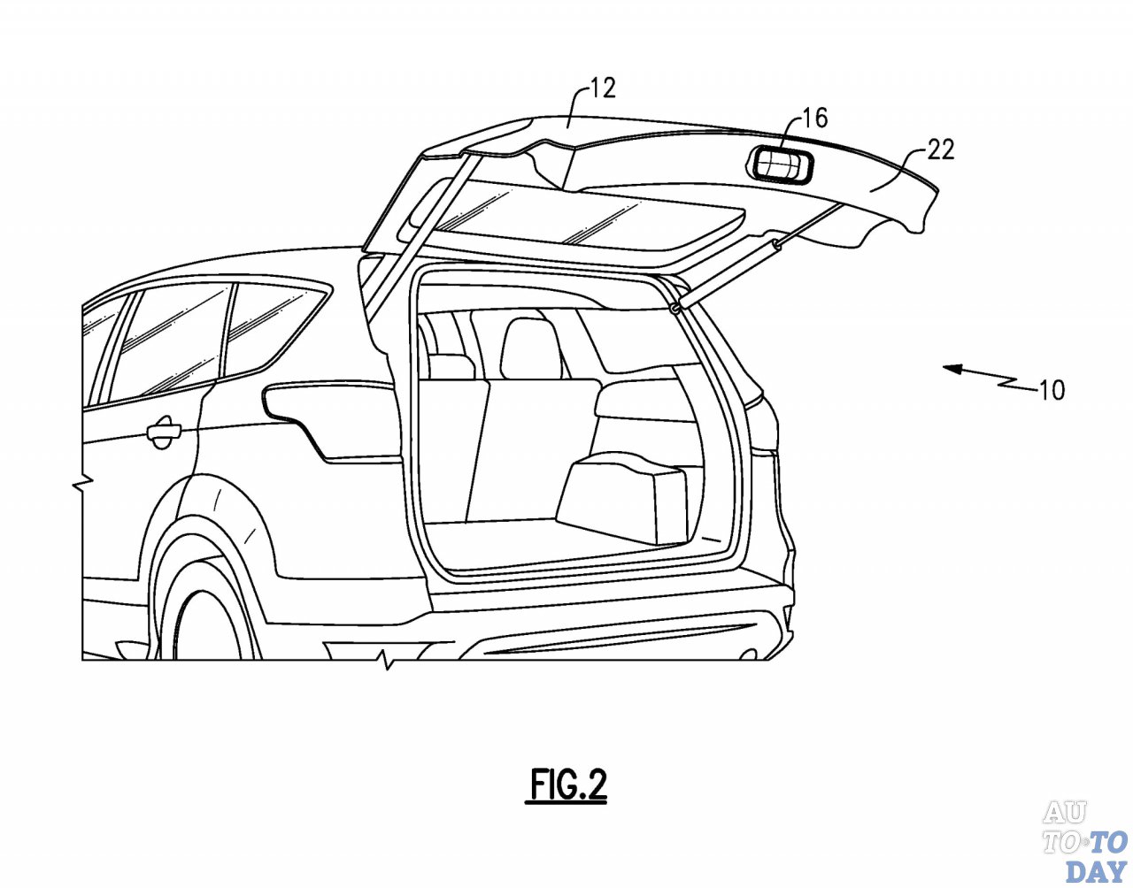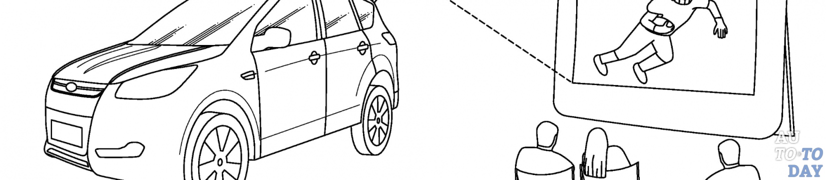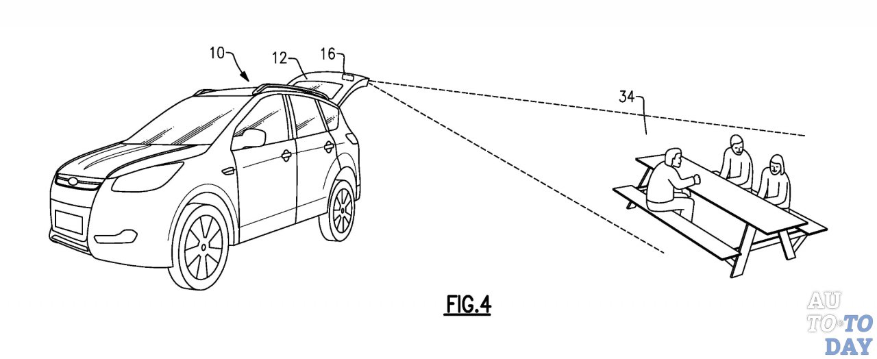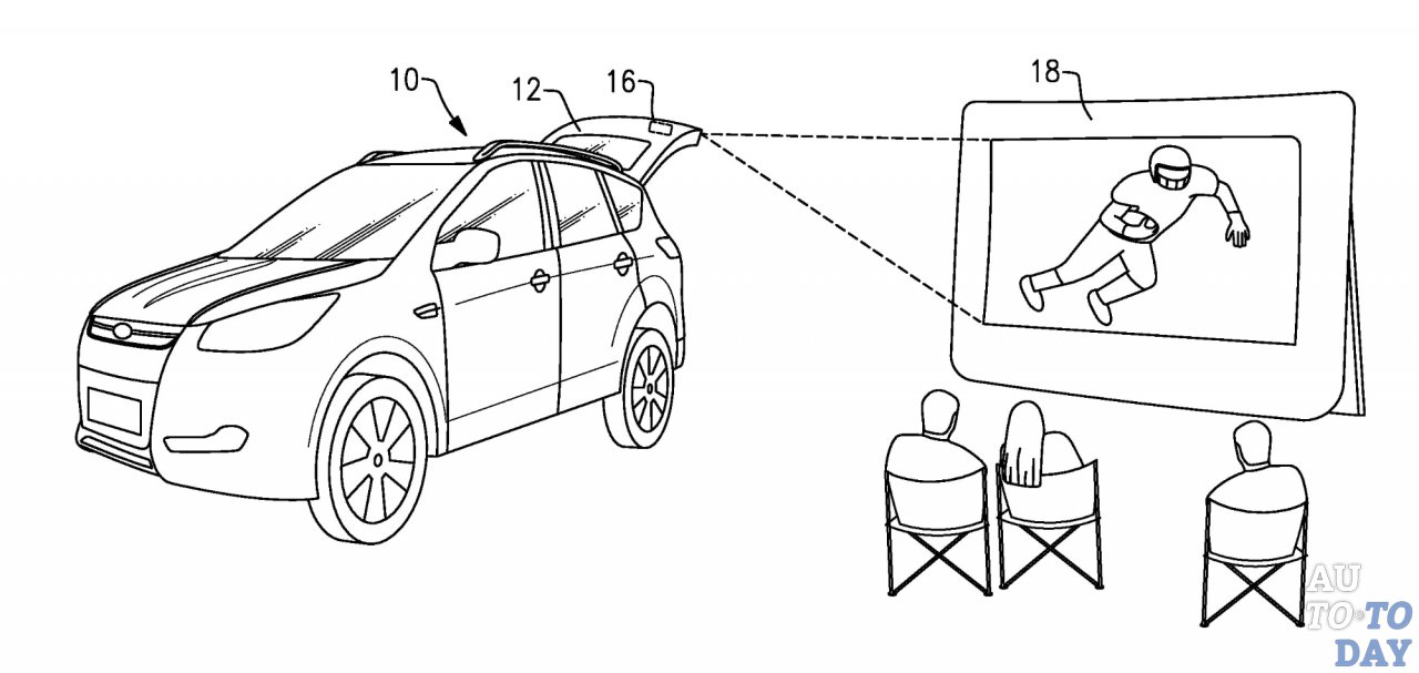 Согласно патенту, это «подъёмная дверь… и видеопроектор, размещённый на задней двери. Он сформирован для отображения видео в направлении от автомобиля, когда дверь багажника открыта».