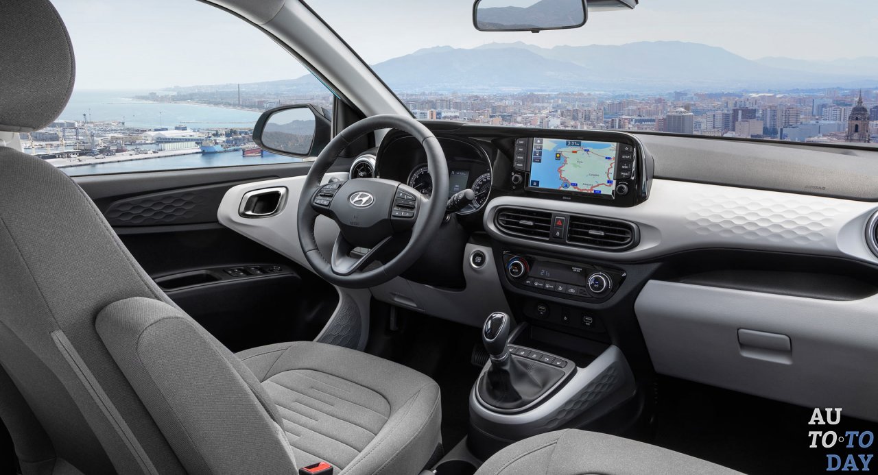 В салоне Hyundai i10 можно увидеть трёхспицевый руль и 8-дюймовую информационно-развлекательную систему с поддержкой Apple CarPlay и Android Auto. Ассортимент систем безопасности включает предотвращение фронтальных столкновений, автоматическое управление дальним светом, удержание в полосе движения, распознавание ограничений скорости и другие современные функции.