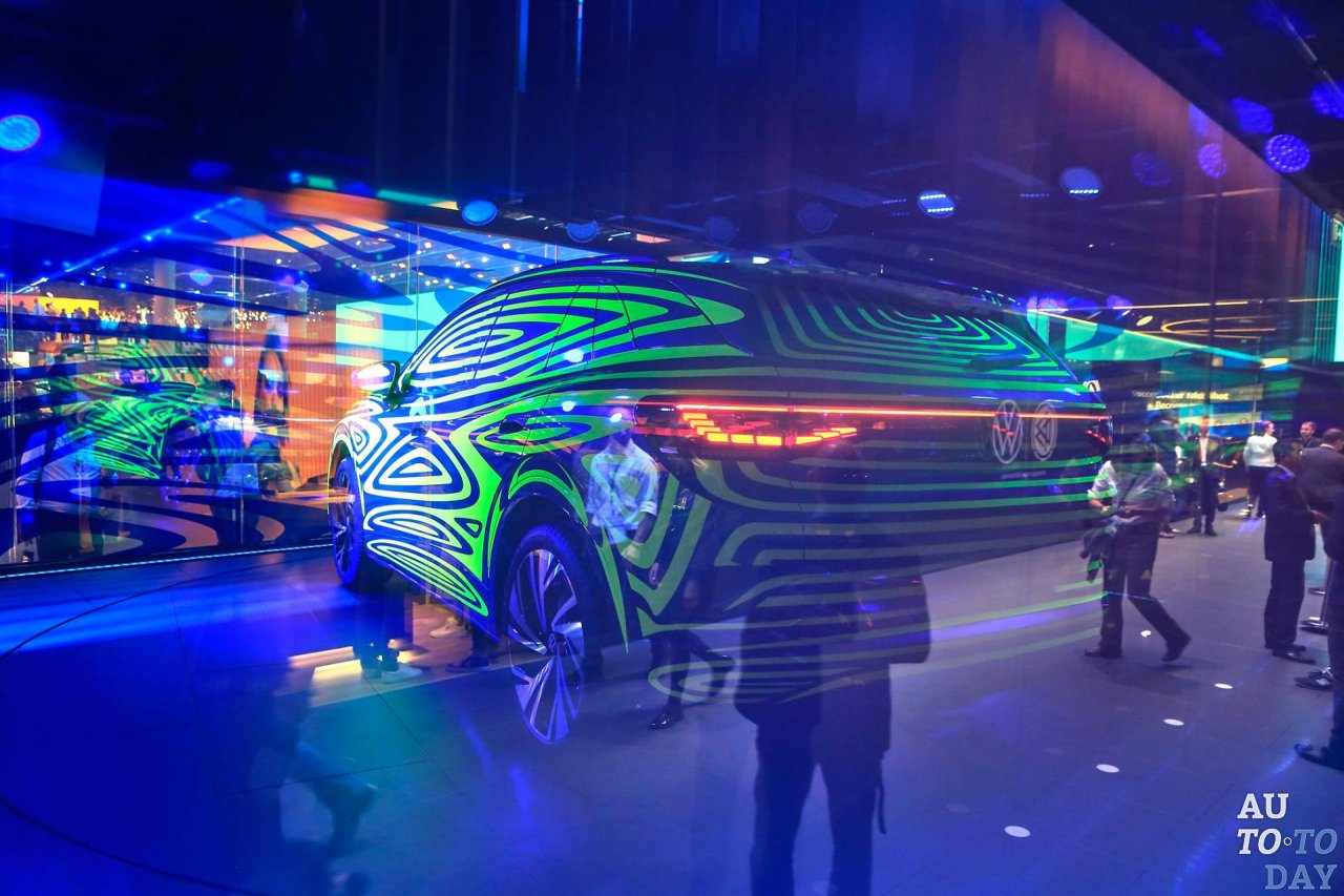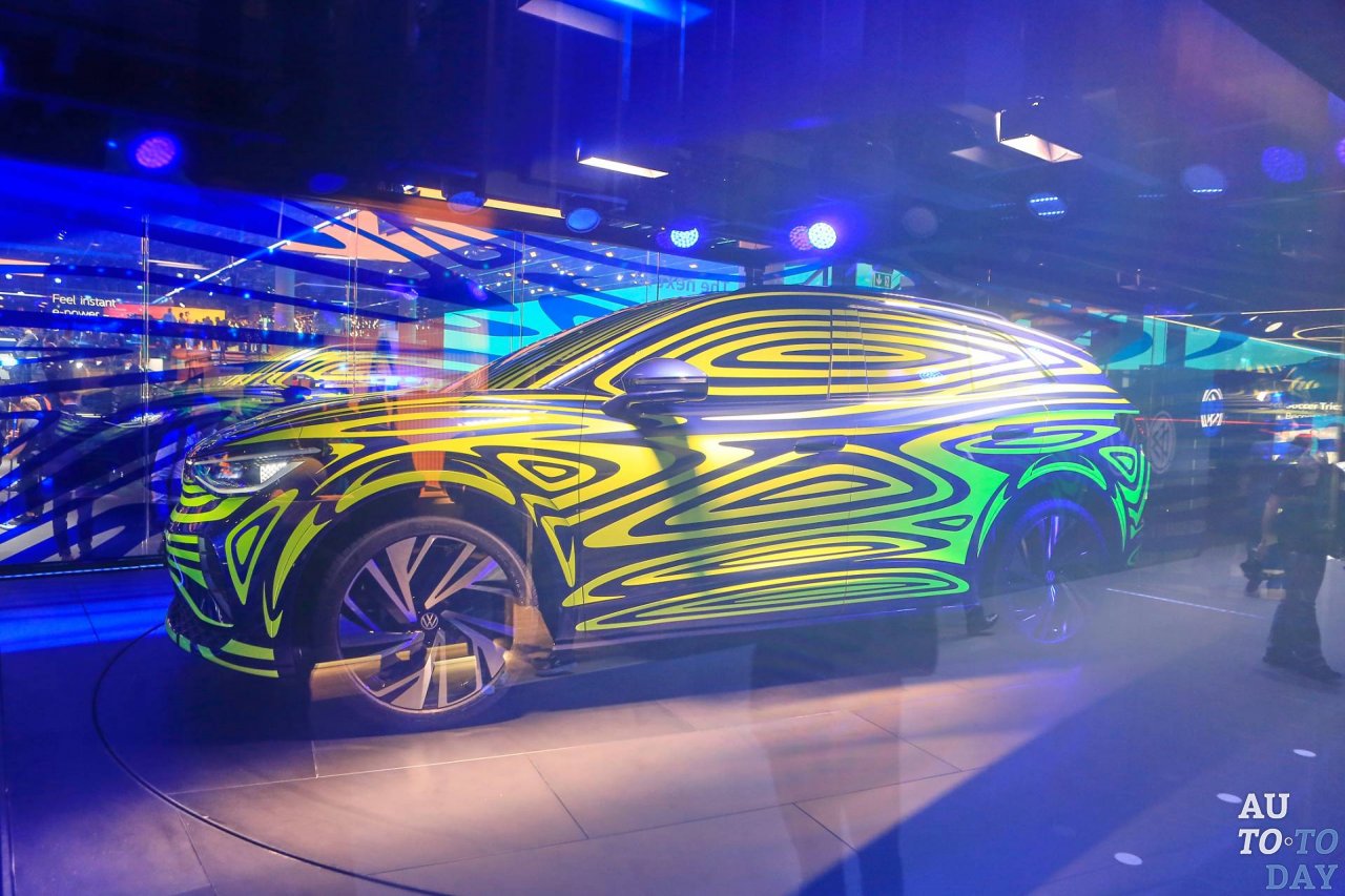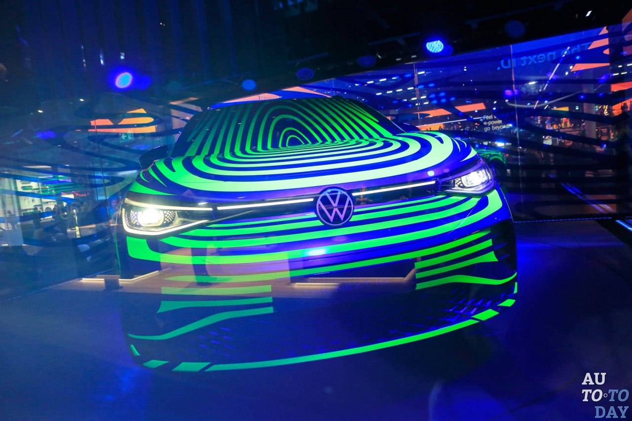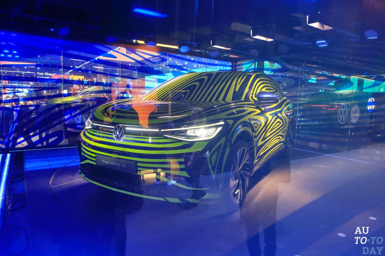 Volkswagen ID.4 окутан гипнотическим камуфляжем и затемнённой стеклянной коробкой, не позволяющей подойти поближе к автомобилю. Ранее он назывался ID Crozz и был представлен в двух концептуальных вариантах.