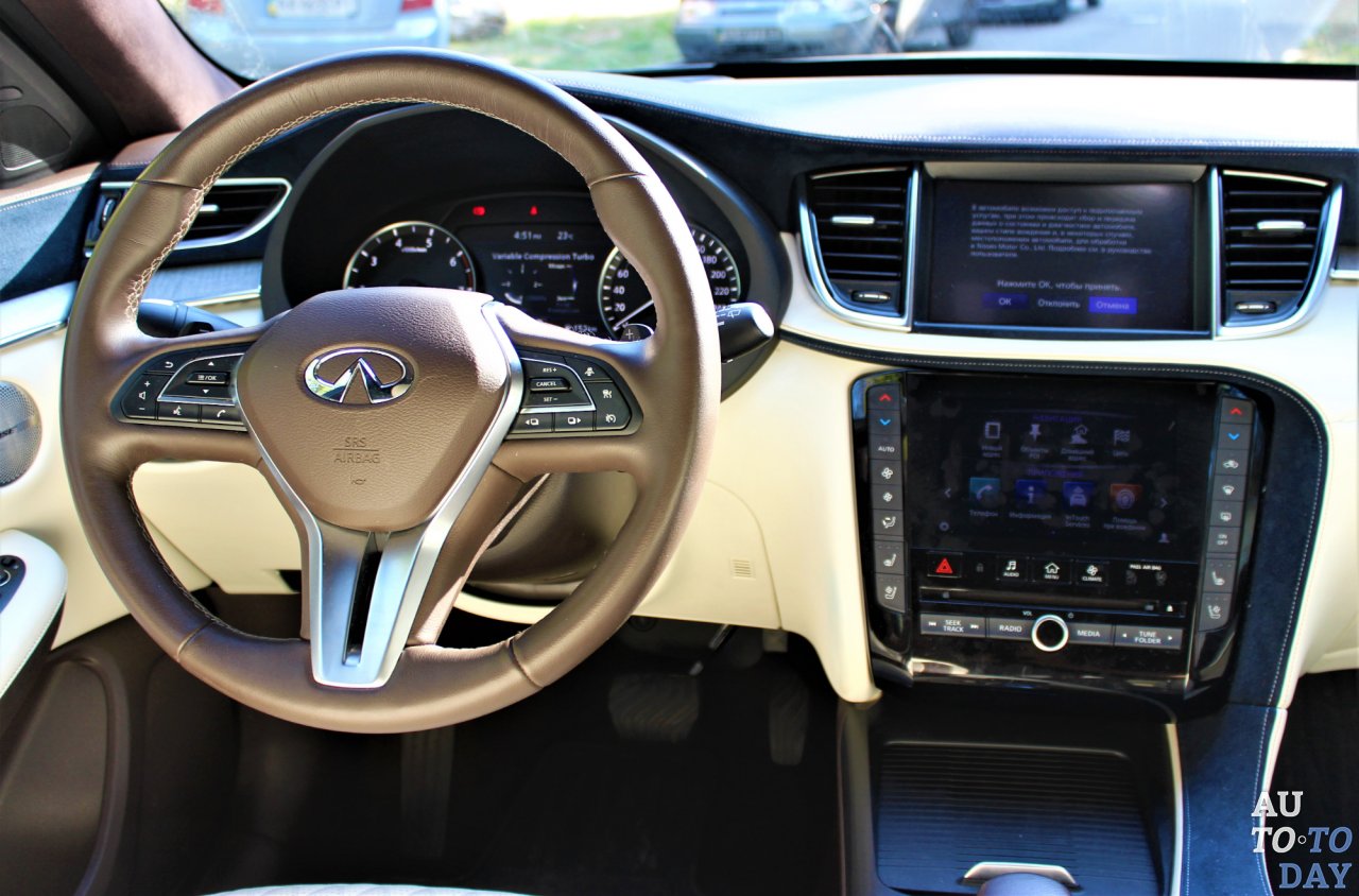 С рулевым управлением DAS (Direct Adaptive Steering) второго поколения мы уже знакомились в ходе теста седана Q50. За рулем Infiniti QX50 понять, что прямая физическая связь между колесами и рулем отсутствует можно только по полному отсутствию вибрации на руле на любых оборотах мотора.