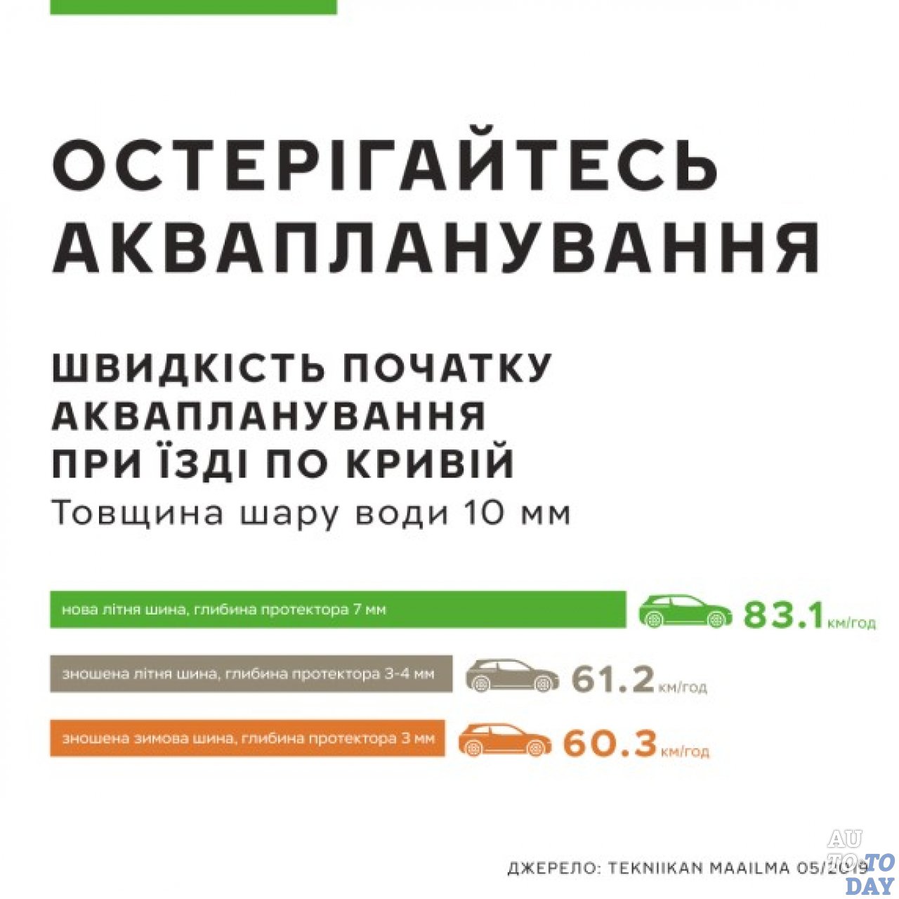 В сравнительном тесте Tekniikan Maailma, опубликованном в выпуске 5/2019, изношенная летняя шина с глубиной протектора 3–4 мм имеет явно худшую управляемость, чем новая летняя шина с протектором 7 мм. В ходе испытаний новой шины начало аквапланирования было зафиксировано на скорости 83,1 км/ч, когда толщина водной подушки на дороге составила 10 мм.
