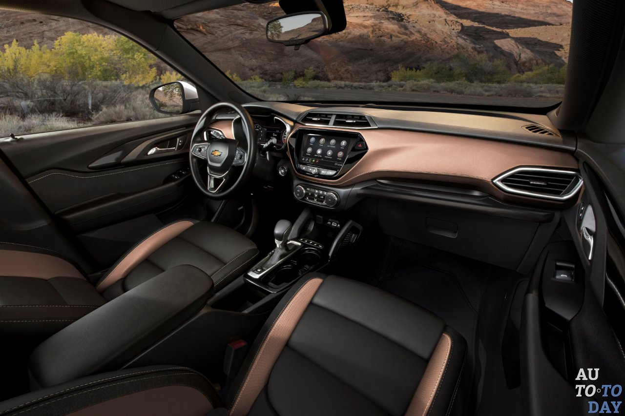 В салоне нового Chevrolet расположилось рулевое колесо с тремя спицами, глянцевая чёрная отделка, металлические акценты и, конечно же, современная мультимедийная система с поддержкой Apple CarPlay и Android Auto.