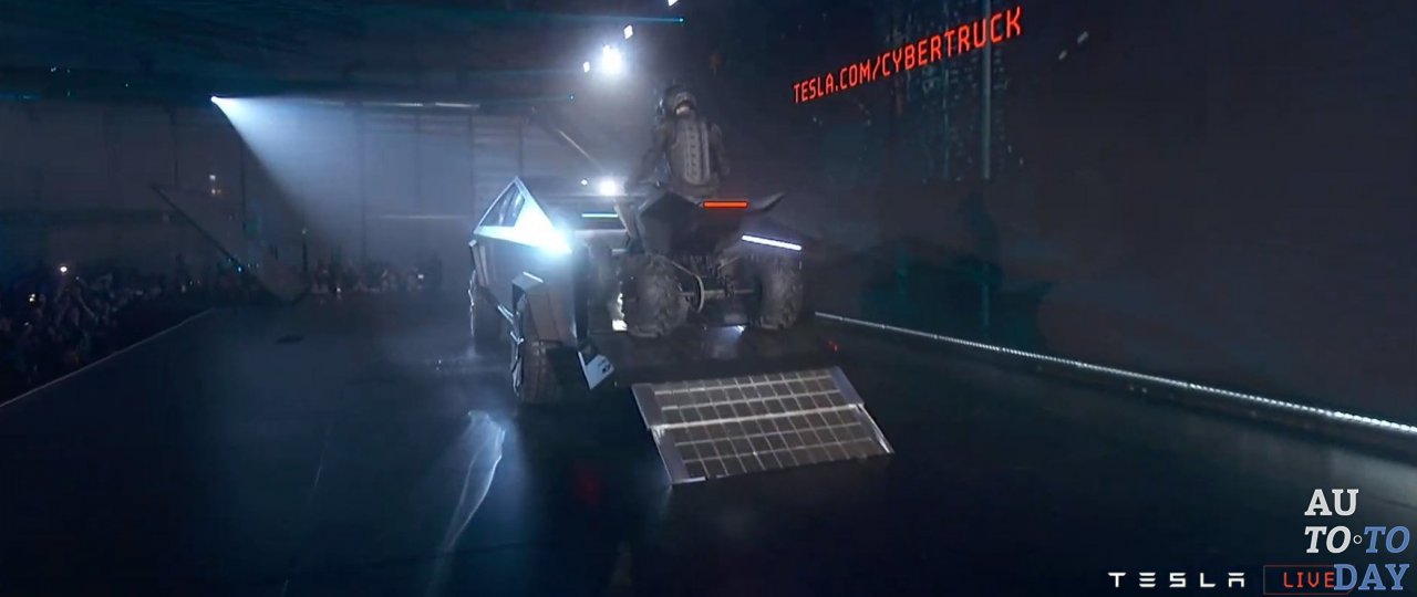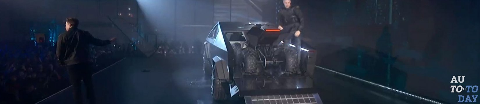 В рамках презентации впечатляющего электрического пикапа Cybertruck Tesla решила наглядно продемонстрировать грузоподъёмность автомобиля и один из сотрудников марки заехал в багажник пикапа на специальном квадроцикле.