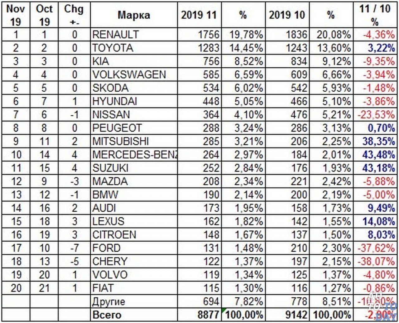 Кроме того, в первой десятке прочно закрепилась Peugeot, а попадание туда бренда Mercedes-Benz, занявшего первое место в премиальном сегменте, стало настоящей сенсацией. Если говорить о марках премиум-класса, то второе место в ноябре отвоевал себе бренд BMW. За ним буквально вплотную идут Audi и Lexus.