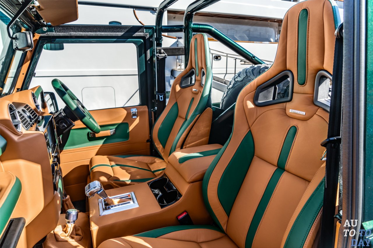 Внутри двухместной кабины появилась двухцветная кожаная обивка, объединяющая светло-коричневый и изумрудный тона, пара спортивных сидений Recaro, контрастная прострочка, приборная панель и центральная консоль, выполненные на заказ.