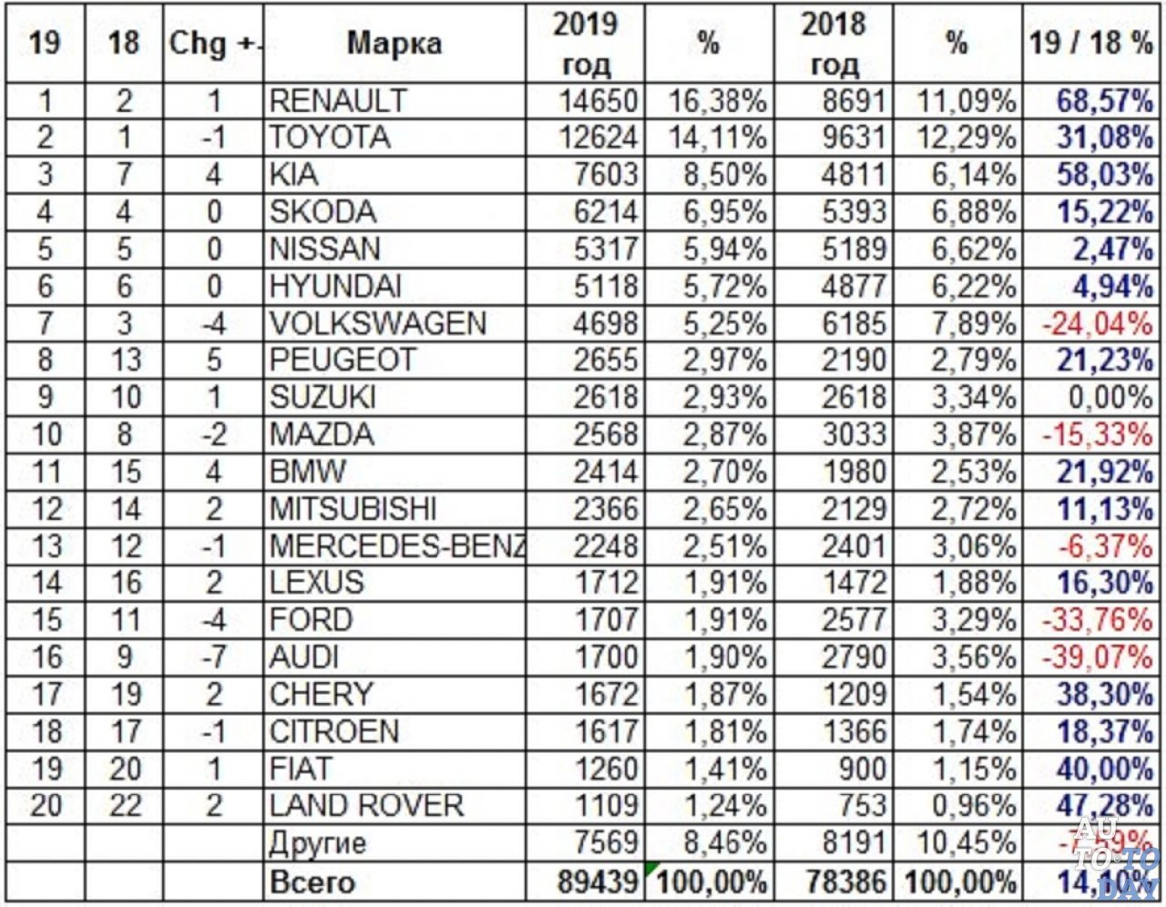 Среди премиальных авто победителем в 2019 году стал бренд BMW, нарастивший продажи на 22%. Существенно поднялась реализация на 11% и у Mitsubishi. Отличились неплохими результатами и такие марки, как Chery, Citroen, Fiat, Land Rover и Volvo.