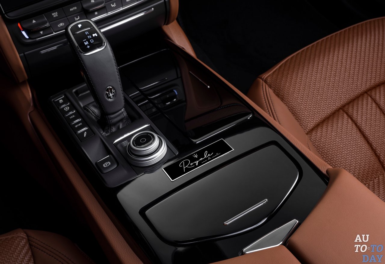 Интерьеры Royale, основанные на версии GranLusso, доступны с отделкой Zegna PELLETESSUTA™ ярко-коричневого цвета или двухцветной черной/ярко-коричневой кожей Pieno Fiore. Zegna PELLETESSUTA™ представляет собой «ткань» из плетёной кожи, которая выпускается эксклюзивно для интерьеров автомобилей Maserati.