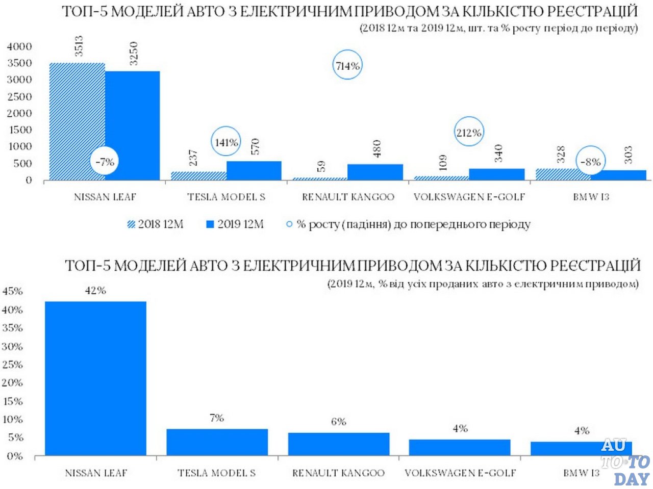 Лидером украинского электромобильного рынка в 2019 году по-прежнему остаётся марка Nissan, которой принадлежит 43% рыночной доли. Хотя этот показатель в 2018 был на 7% больше.