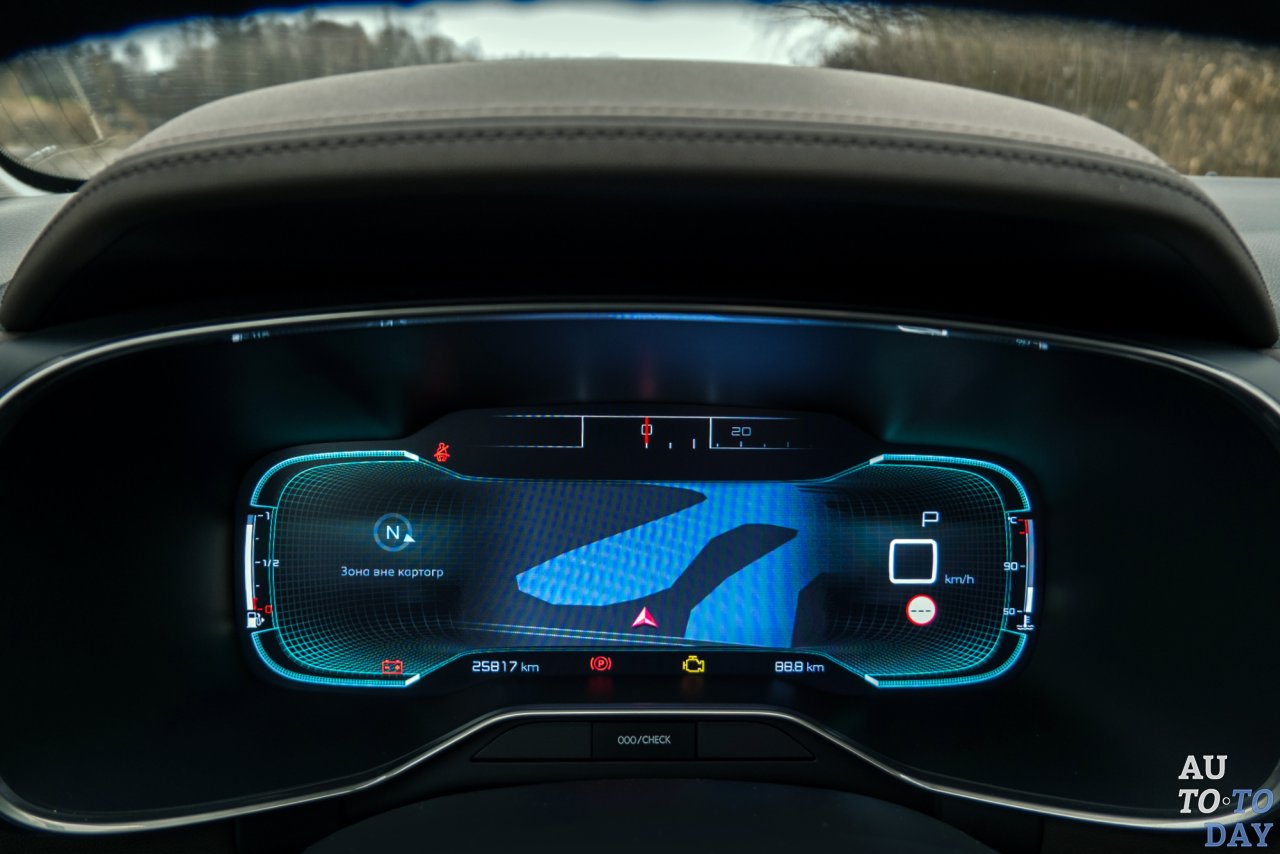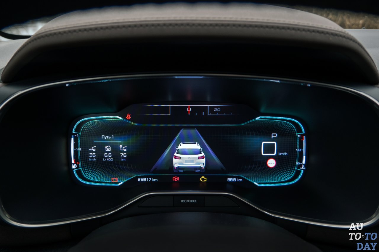 Массивное торпедо выделяется строгой и лаконичной центральной консолью с сенсорными кнопками. Отмечу, что они реагируют на нажатия. Главная задача водителя – лишь запомнить их порядок, чтобы в движении не отвлекаться, промазать же не получится. Вертикальные дефлекторы обдува, массивный подлокотник, хромированные вставки вместе создают эффект пребывания в автомобиле классом выше. Щиток приборов заслуживает отдельного внимания. Его роль выполняет горизонтальный дисплей. Отельным колесиком на руле можно оперативно менять выводящуюся информацию – данные электронных ассистентов, побольше приборов, карту на весь экран и пр. Каких-то промедлений или глюков замечено не было, только затяжные повороты навигатор рисует как изломленную линию – к этому надо привыкнуть.
