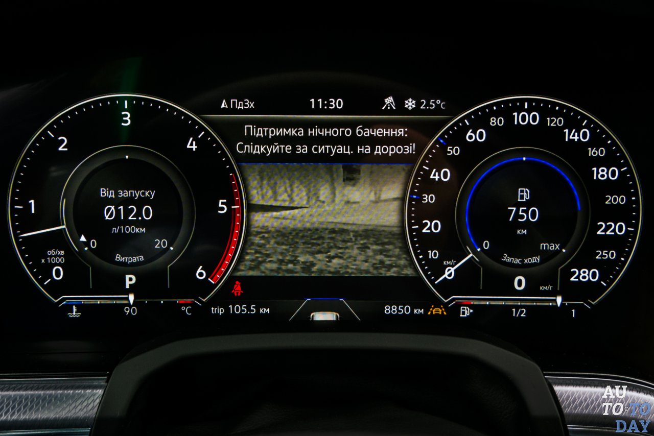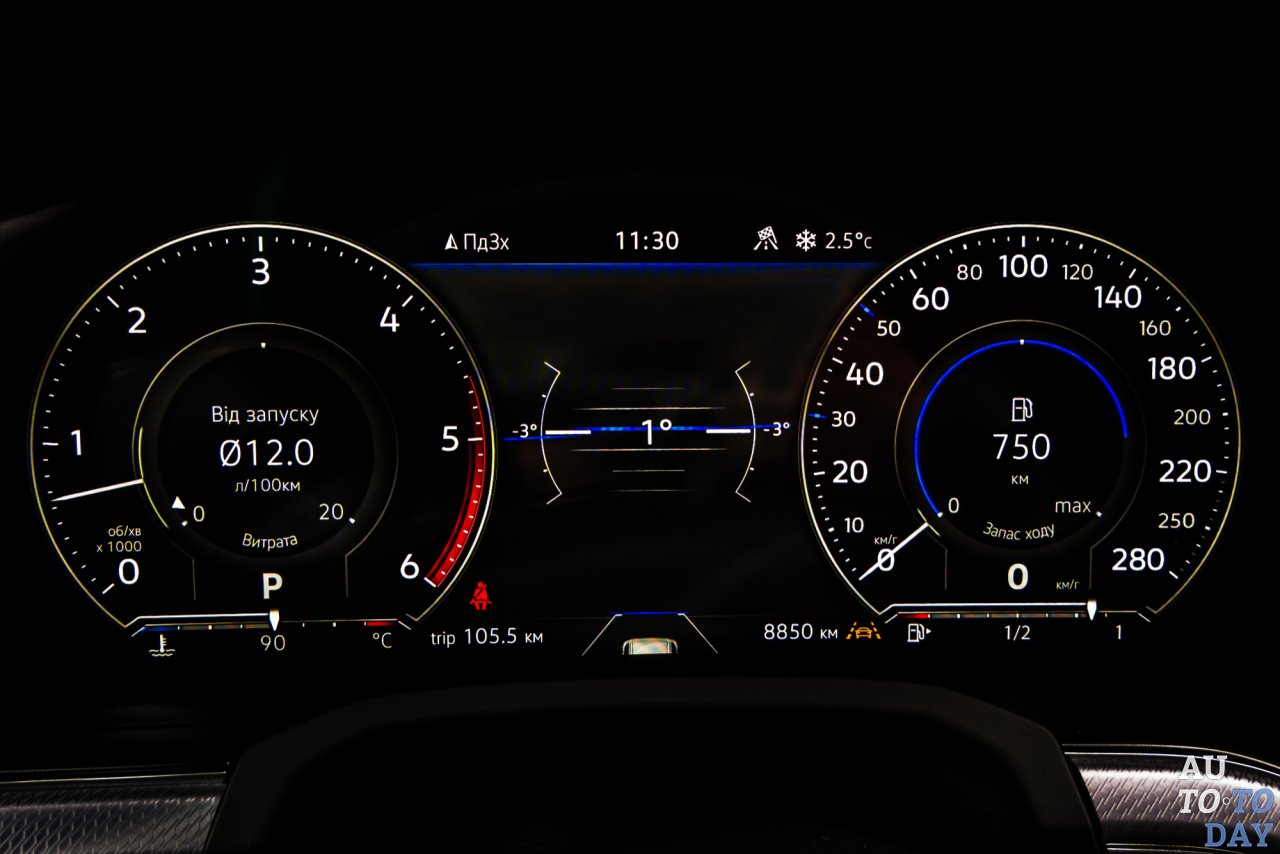 У нас на тесте – автомобиль в максимальной комплектации, в исполнении R-Line. Среди главных отличий от более скромных комплектаций – несколько уменьшено количество хромированной отделки спереди, накладки на колесные арки окрашены в цвет кузова, огромные колесные диски (до 21 дюйма) и соответствующие шильдики по периметру кузова. Вообще же в любом исполнении герой нашего тест-драйва выглядит внушительно и монументально. Во многом – благодаря несколько изменившимся пропорциям автомобиля. «Фолькс» вырос на 7 сантиметров в длину, стал на 4 см шире и даже на 7 мм ниже. Потому-то он и кажется более приземистым и широким. Вот что одновременно эффектно и эффективно, так это головная оптика.