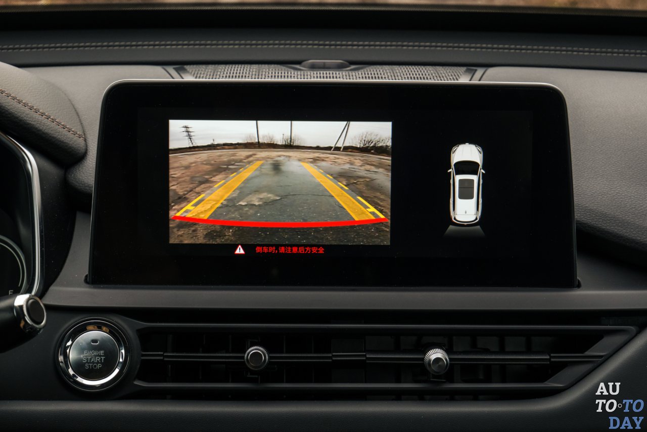 Основной 10-дюймовый экран инфотеймента может транслировать видеофайлы с «флешки», поддерживает «смартфонные» протоколы Apple CarPlay и Android Auto и отображает картинку с камеры. На экране парковочного ассистента, кстати, можно заметить неточности в локализации. При включенной камере заднего вида предупреждения о потенциальных опасностях почему-то выводятся на родном машине языке, а раздел «Мультимедиа» назван «Средствами массовой информации». Забавно.