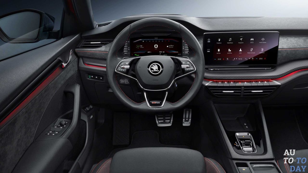 Отделка салона новой Skoda Octavia RS iV выполнена в черном цвете. Многофункциональное спортивное кожаное рулевое колесо представлено с тремя спицами с логотипом vRS и лепестками управления DSG. Передние спортивные сиденья обтянуты черной тканью, опциональные сиденья Ergo оснащены Alcantara и кожаной обивкой, а также имеют регулировку поясничного подпора. Сиденья маркированы логотипом RS и цветными декоративными строчками красного или серебристо-серого цвета, которые также можно найти на кожаном руле, подлокотниках и приборной панели. Декоративные полосы в стиле RS и алюминиевые педали завершают спортивный образ.