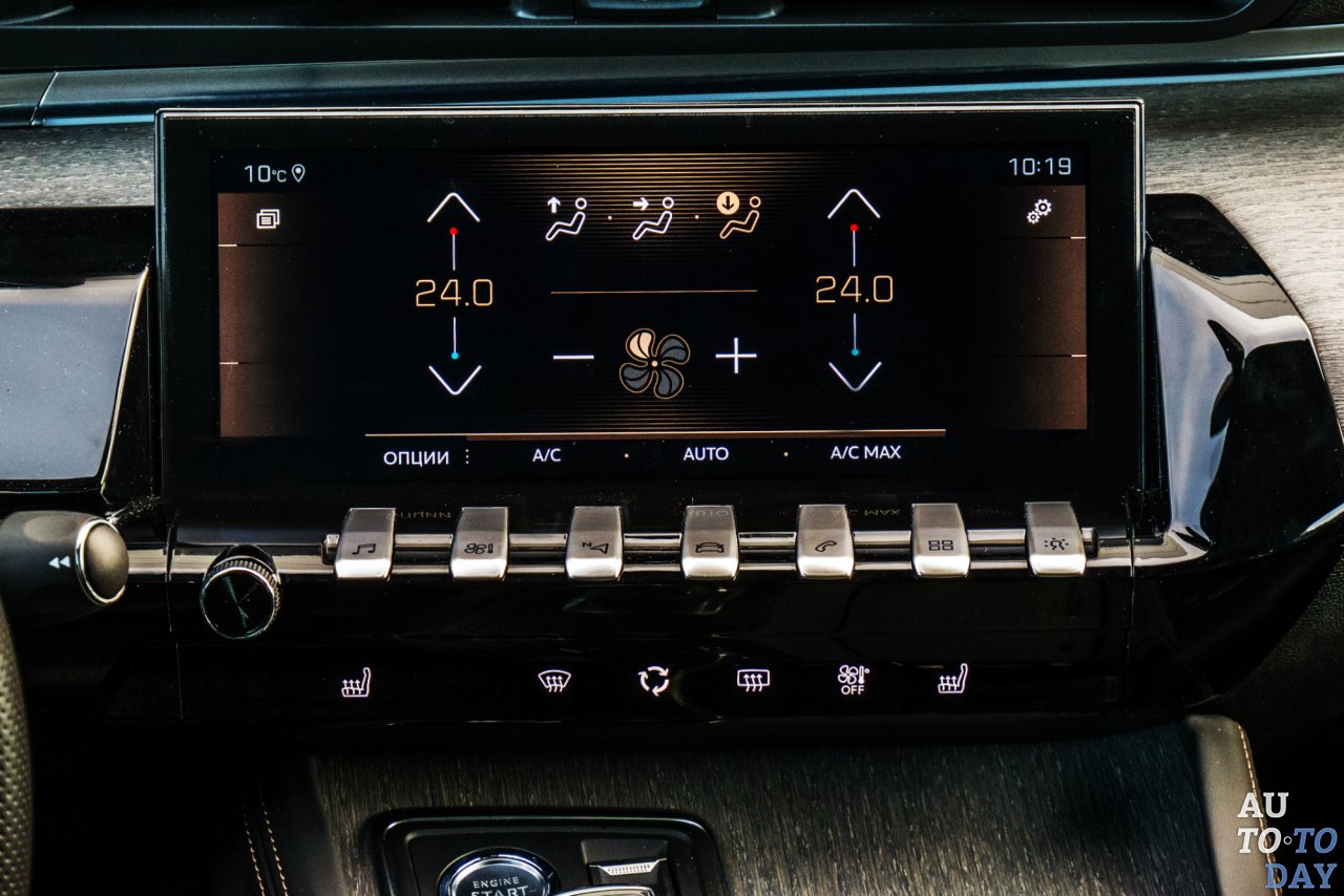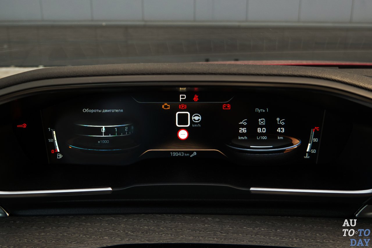 Приборная панель – полностью цифровая, с диагональю 12,3 дюйма. На выбор предложено несколько тем и комбинаций. Схожее сочетание мы уже изучали с кроссовером Citroen C5 Aircross. При необходимости в одно из «кругляшей» приборов можно вывести информацию с камеры ночного видения. Как бы удобно я не усаживался, верхняя кромка руля немного перекрывает самый низ «приборки», но не критично. Небольшого диаметра руль мы уже встречали на кроссовере Peugeot 5008. В поворотах на трассе – удобнее не найти. Но в городе его быстро «перекладывать» не всегда удобно. 8-дюймовый дисплей инфотеймента не «бликует» на солнце, но не всегда идеально отзывается на жесты водителя.