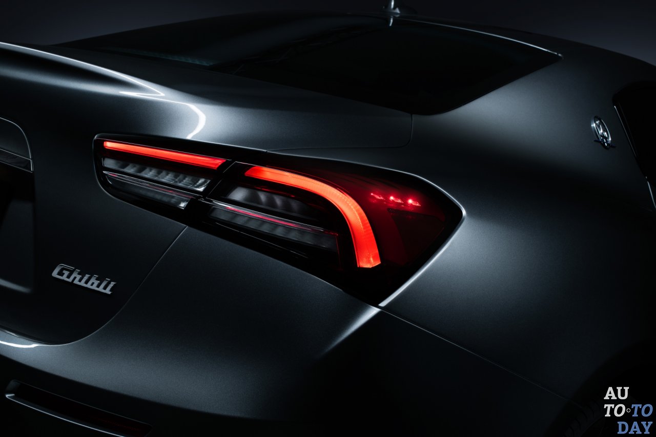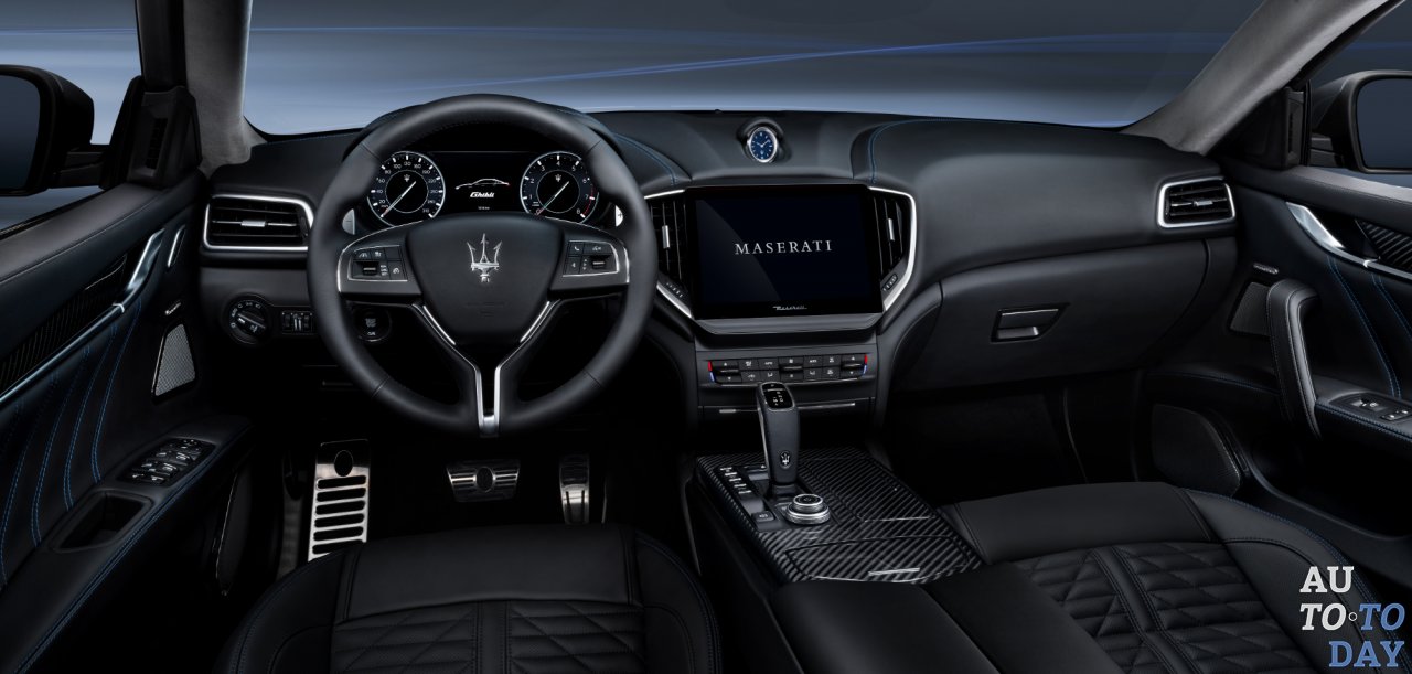 Во внешнем виде синий цвет представлен на трех характерных воздуховодах, тормозных суппортах и молнии в овале, который обводит трезубец на задней стойке. Этот же синий цвет появляется внутри автомобиля, в прострочке сидений. Новый Ghibli Hybrid также представляет новое стилистистическое содержание, начиная от решетки радиатора, вертикальные элементы которой теперь символизируют камертон, музыкальный инструмент для воспроизведения эталонного звука, который сам напоминает формой трезубец. Серьезные изменения есть и в задней части автомобиля, где измененные фонари в форме бумерангов вдохновлены моделью 3200 GT и концепт-каром Alfieri.