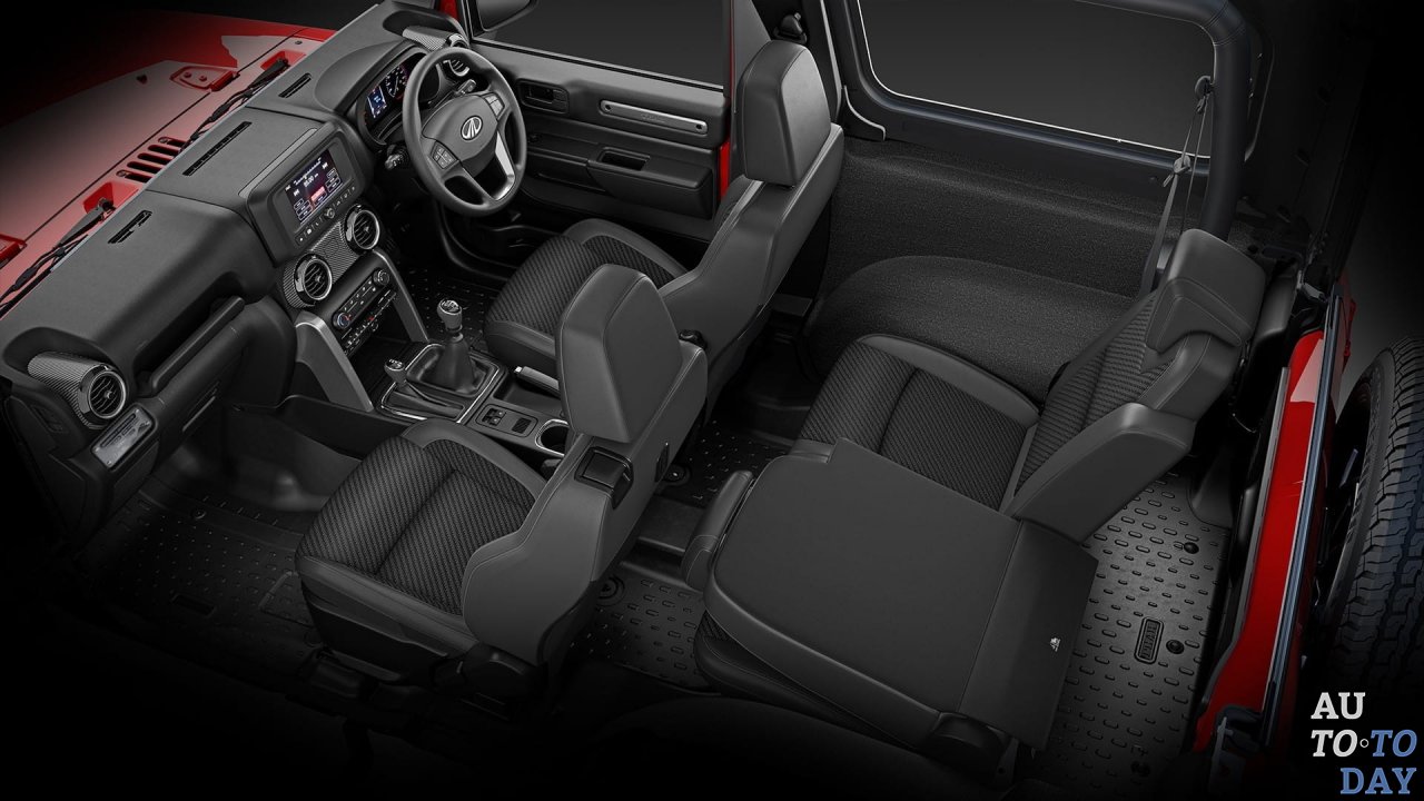 «Махиндра» мало что сказала об интерьере, но он во многом заимствует у Wrangler предыдущего поколения – даже с использованием круглых вентиляционных отверстий в аналогичных местах. Водители также найдут 7-дюймовую информационно-развлекательную систему с сенсорным экраном, отделку из искусственного углеродного волокна и TFT-дисплей в комбинации приборов. Клиенты также выбирают между четырех- и шестиместными конфигурациями сидений.