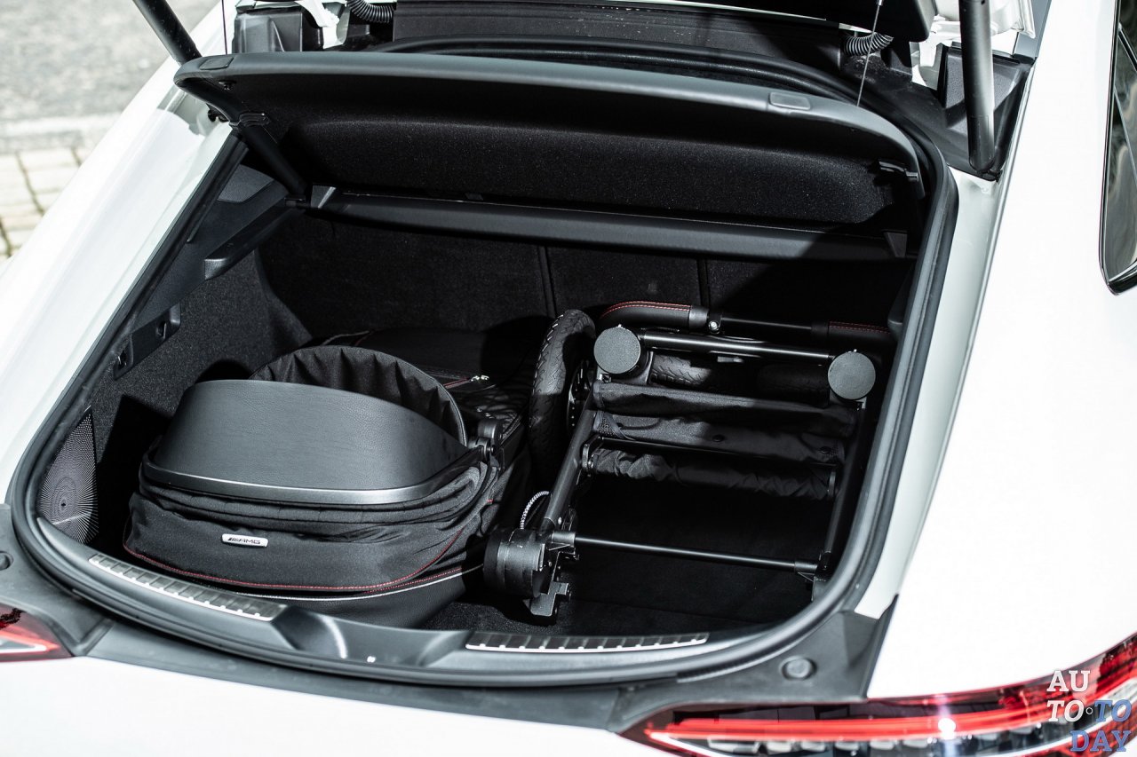 Для перевозки коляски Mercedes-AMG не нужен автомобиль с большим багажником, так как в сложенном виде она имеет сверхкомпактные размеры 69 × 58,5 × 31 см, поэтому она может поместиться в багажнике спортивных автомобилей компании.