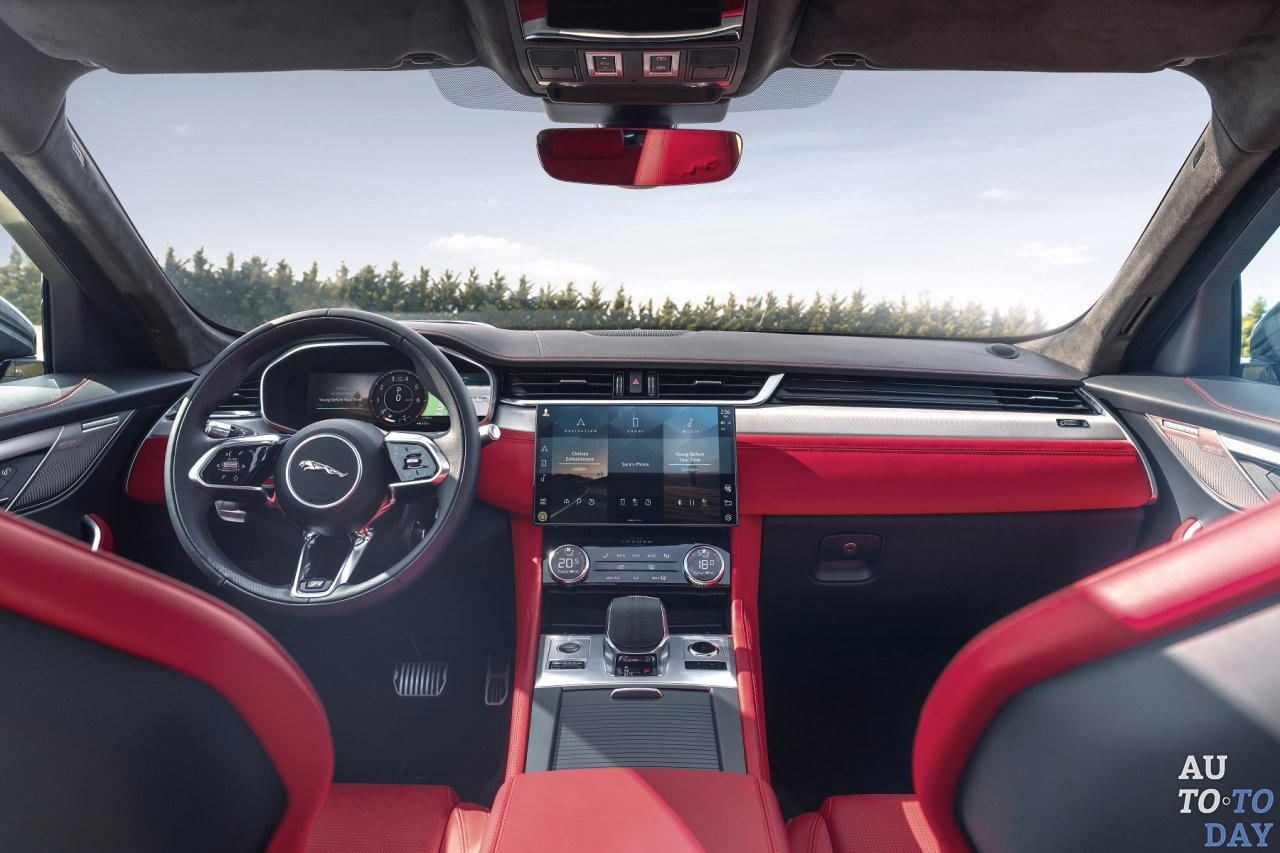 В сердце нового салона — установленный в центре и органично интегрированный сенсорный HD дисплей из выгнутого стекла с диагональю 11,4 дюйма в элегантной рамке из магниевого сплава. С его помощью водитель управляет новой информационно-развлекательной системой Pivi Pro. Аутентичные детали отделки, в частности элементы из алюминия и деревянного шпона с открытыми порами, привлекают внимание идеальными формами. Созданные с помощью лазерной гравировки сетки динамиков и металлический диск поворотного переключателя системы JaguarDrive Control воплощают особое внимание к деталям.