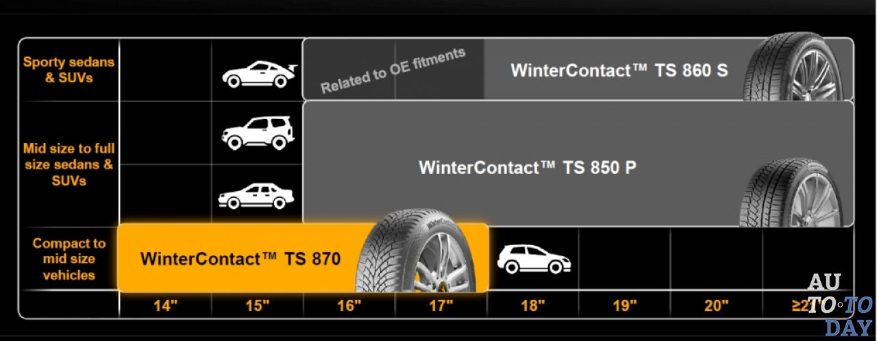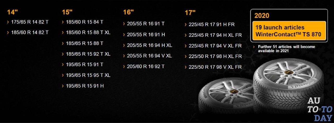 К наступающему зимнему сезону компания Continental подготовила 19 типоразмеров WinterContact TS870 с посадочным диаметром от 14 до 17 дюймов. Это типоразмеры для моделей малого и среднего классов.