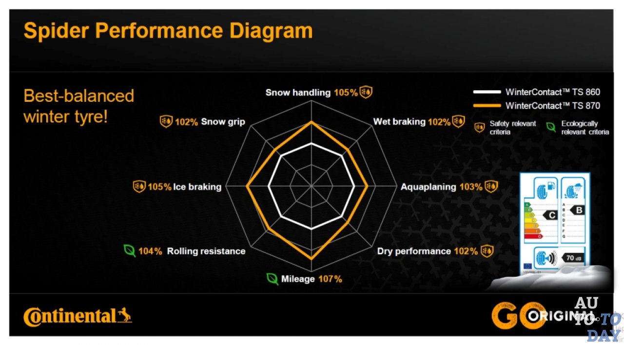 В модели Winter Contact TS870 изменились почти вся составляющие шины. Это и новый протектор, и новые резиновые смеси для протектора. Так новый рисунок протектора и обновленная резиновая смесь улучшили сцепные свойства на льду, снегу и даже на мокром асфальте. При этом удалось повысить износостойкость резины и снизить сопротивление качению. С улучшениями в процентном виде можно ознакомиться на графике.