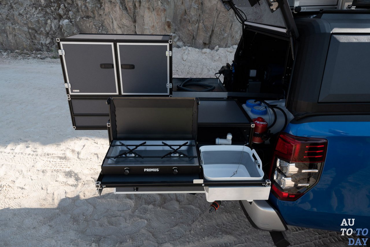 Mitsubishi также разработала несколько индивидуальных решений для кемпинга для L200. Например, пикап может быть оснащен газовой плитой Primus, выдвигающейся из кровати, а также умывальником, ящиком для столовых приборов, 12-вольтовым соединением и водопроводом, а также рядом отсеков для хранения вещей. Весь пакет можно приобрести за 3600 евро, а его можно хранить под запирающимся навесом над кроватью за дополнительные 1949 евро. Выбор большой палатки GT Pickup стоит 3410 евро.