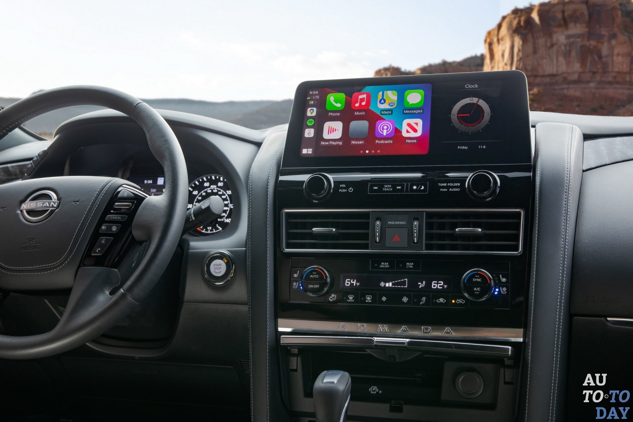 Обновленная центральная консоль оснащена 12,3-дюймовым цветным сенсорным экраном, информационно-развлекательной системой с Apple CarPlay и Wi-Fi. Nissan утверждает, что этот дисплей является самым большим в своем классе, и он входит в стандартную комплектацию всех марок Armada.