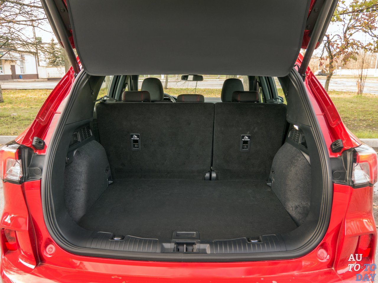 Багажный отсек по умолчанию готов принять 556 литров грузов. Если сложить спинку второго ряда, то получим 1530 литров. Отметим, что крышка багажника может открываться по взмаху ноги, и работает эта опция с первого раза. Временное запасное колесо расположилось под полом.