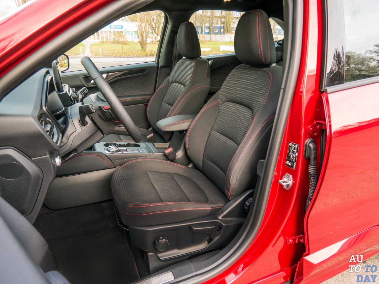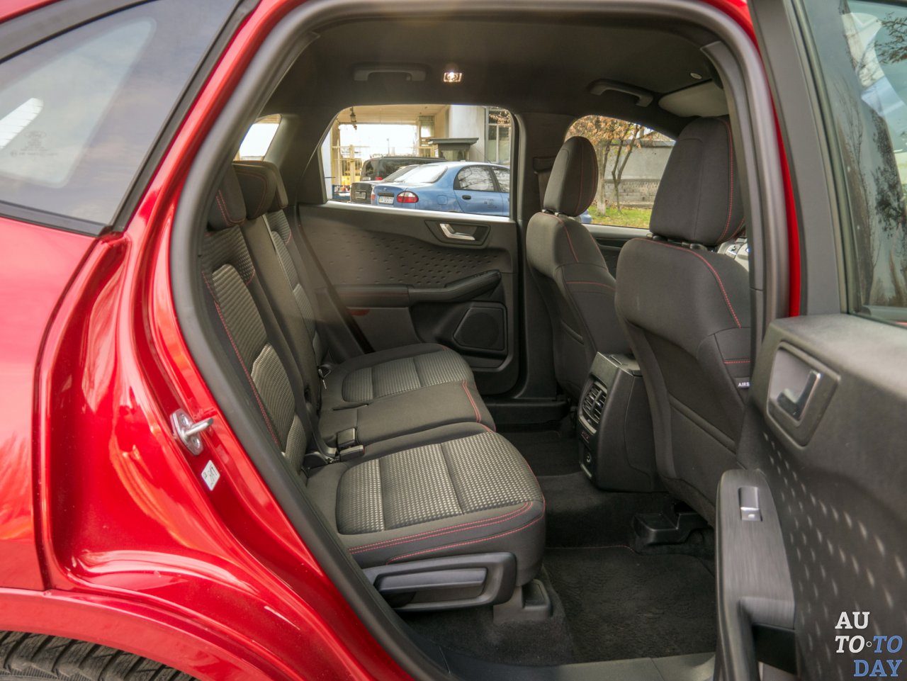 Но передняя часть кроссовера очень самобытна. Так, шестиугольная решетка радиатора, заходящие на капот и крылья фары – это характерные черты «Фордов» новой генерации. Благодаря сходству с новыми Focus перепутать спереди марку машины трудно. Хотя с прошлыми «Кугами» во внешности героя нашего теста почти ничего не связывает. Автомобиль в комплектации ST-Line лишен элементов из неокрашенного пластика, чем говорит нам о своем городском и даже загородном характере, но никак не о настроении к покорению бездорожья.