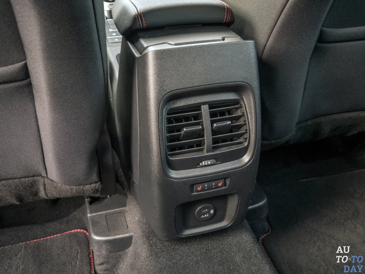 Несмотря на серьезный ценник, все кресла имеют тканевую обивку и механические регулировки. К материалам отделки у нас не возникло никаких вопросов – везде мягкий пластик, тканевые вставки на дверных картах, даже правое колено водителя упирается в «подушечку» на трансмиссионном тоннеле. На втором ряду места предостаточно, присутствуют регулировки второго ряда по углу наклона и есть трехуровневый подогрев двух половинок. Но странно не заметить на спинке подлокотника.