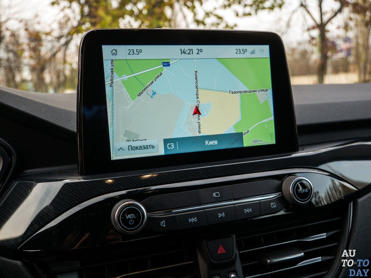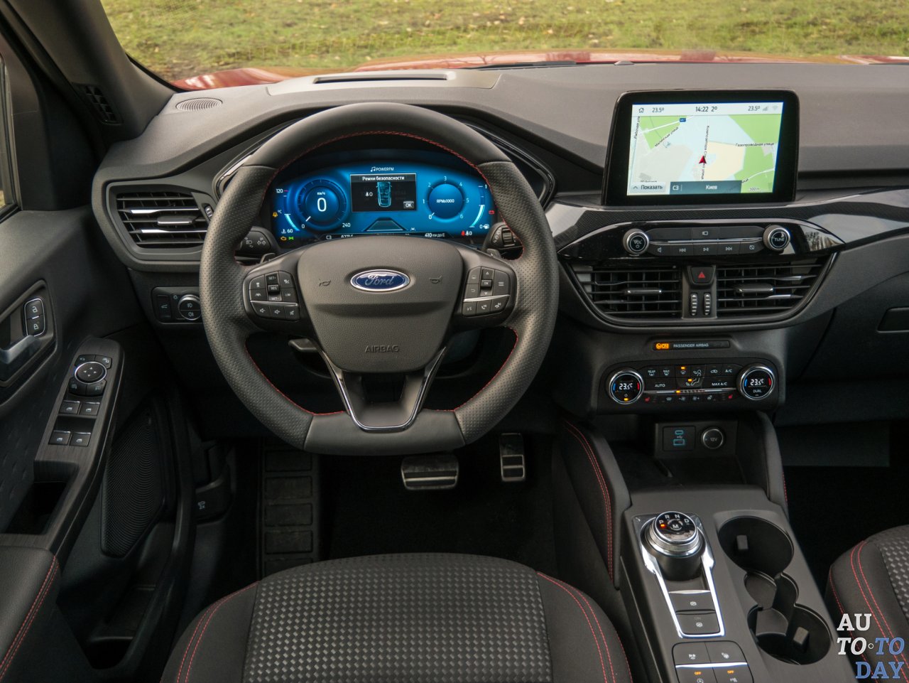 Второй дисплей, 8-дюймовый, расположился над центральной консолью. Мультимедиа получило немного обновленный интерфейс, но весь функционал нам хорошо знаком по Focus. Рулевое колесо органами управления также напоминает машины С-класса, но на «Куге» руль имеет большую толщину обода и меньший диаметр – привет азартным ноткам в управлении. Вместо рычага КПП – ставшая традиционной «фордовская» шайба.