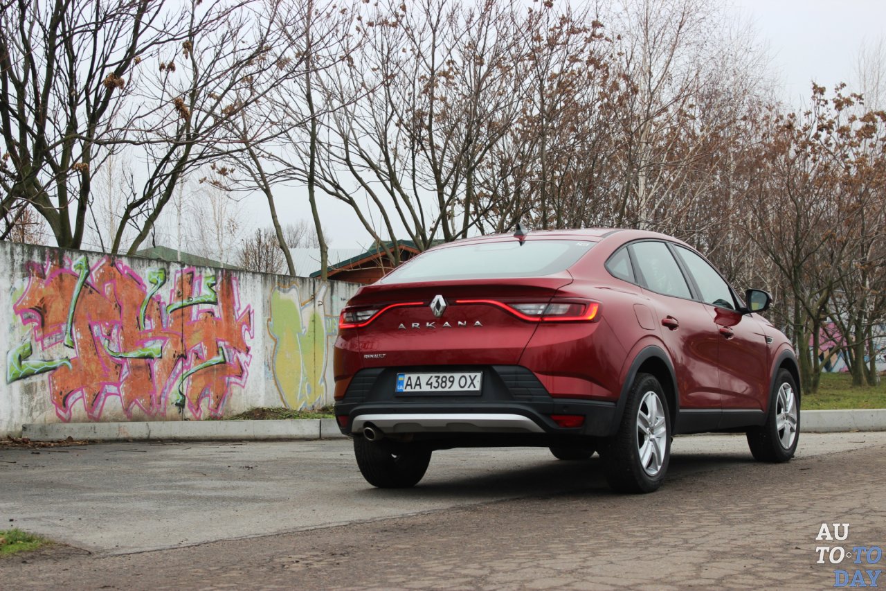 Самая эффектная часть с кормы – это вытянутые и почти сомкнутые задние фонари. В двух начальных комплектациях камера заднего вида отсутствует, так что к габаритам кроссовера нужно привыкать, в подмогу – звуковые датчики парковочного ассистента. «Аркана» крупнее соплатформенного «Дастера» и по длине, и по колесной базе.
