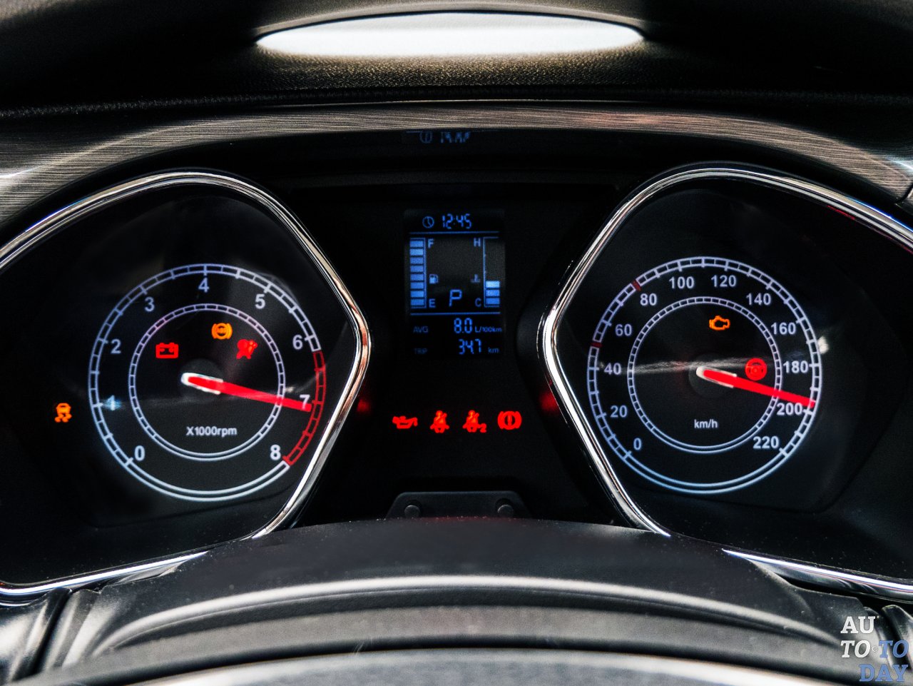 Водителя встречает нескучной формы передняя панель, на которой можно насчитать почти с десяток разнообразным материалов: твердые и мягкие, матовые и глянцевые пластики, кожзам с контрастной строчкой и пр. Щиток приборов имеет приятную бледно-синюю подсветку, яркость которой можно регулировать, независимо от того, включены фары, или нет. Сами циферблаты по своему дизайну напоминают некоторые корейские и немецкие бренды, но от того только выигрывают, ведь с четкостью восприятия информации и удобством шрифтов у них все в порядке.