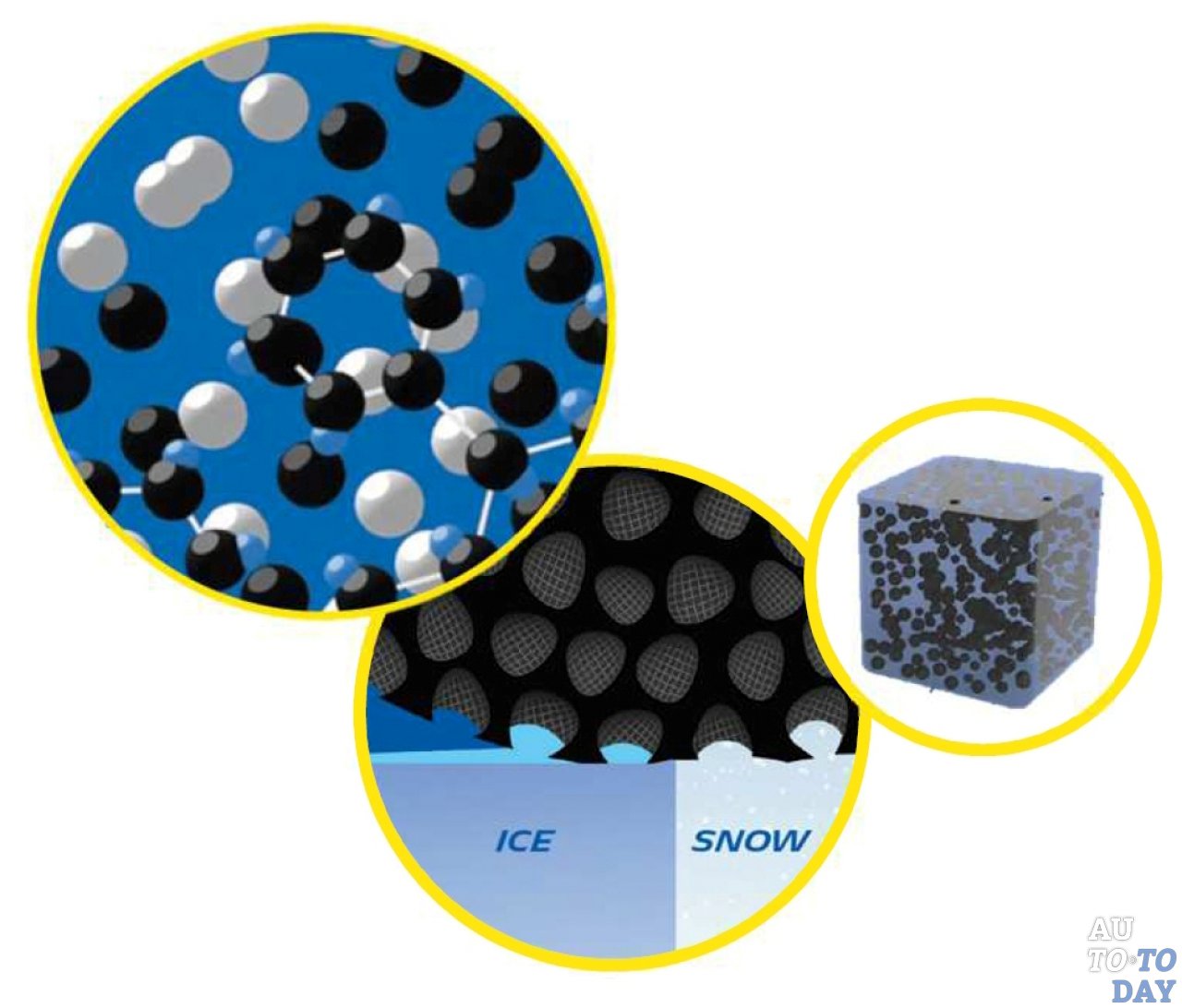Новаярезиновая смесь FLEX-ICE с вкраплениями частиц полимеров обеспечила шине лучшие сцепные свойства на льду и снегу на протяжении всего срока службы.