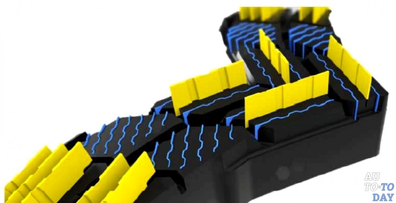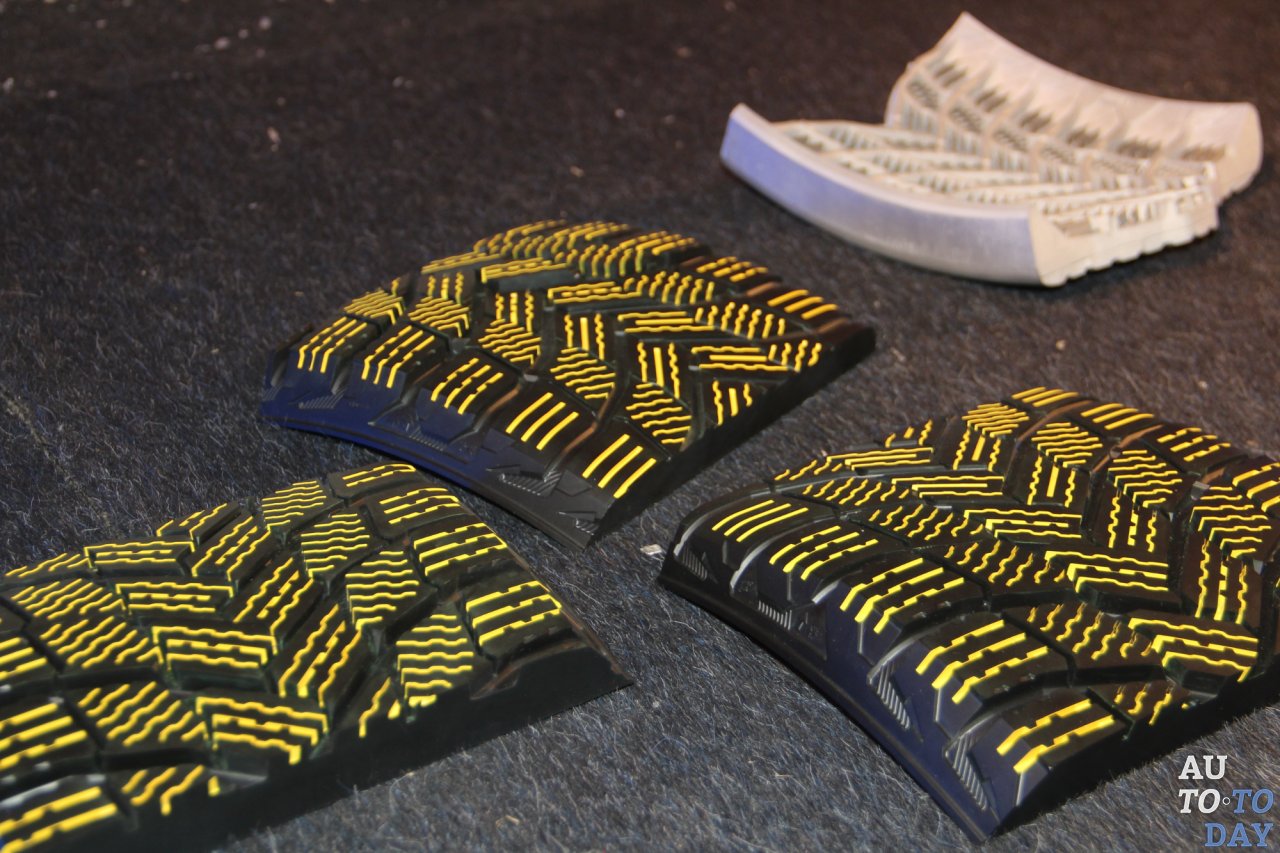 А чтобы увеличение объема канавок не снизило сцепные свойства на льду и укатанном снегу, в блоках протектора сделали два новых типа трехмерных ламелей – П-образные и с переменной толщиной. Первые сохраняют жесткость блоков при маневрах, чем улучшают управляемость – точность и быстроту реакций машины на повороты руля. Ламели с переменной толщиной эффективно срезают водяную пленку на льду, и благодаря накоплению в них снега обеспечивают эффект прилипания на снежной дороге. Такая работа ламелей в обоих случаях повышает сцепление со скользкими покрытиями дороги.