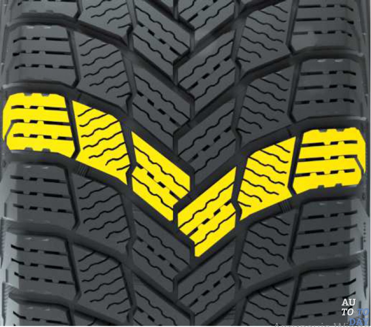 Новый V-образный рисунокпротектора с более крупными водоотводнымиканалами и новыми блокамиболее эфективно выдавливаютснег и воду из пятна контакта.