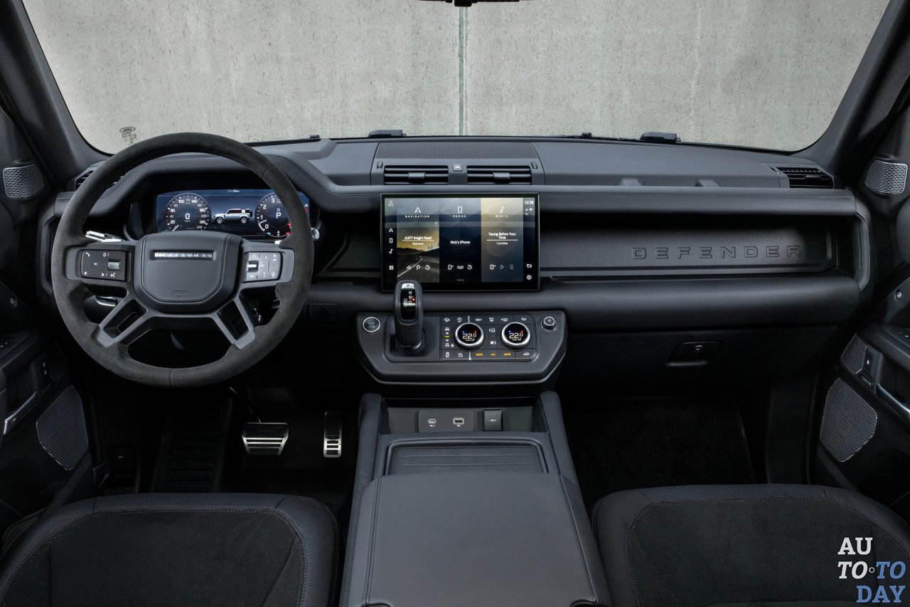 В салоне Defender V8 есть сделанная на заказ кожа Windsor цвета Ebony на сиденьях, а также различные замшевые ткани и акценты Robustec. Рулевое колесо с четырьмя спицами также отделано алькантарой и оснащено парой подрулевых лепестков переключения передач с сатинированным хромом.
