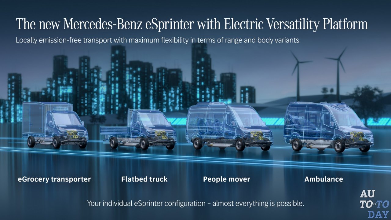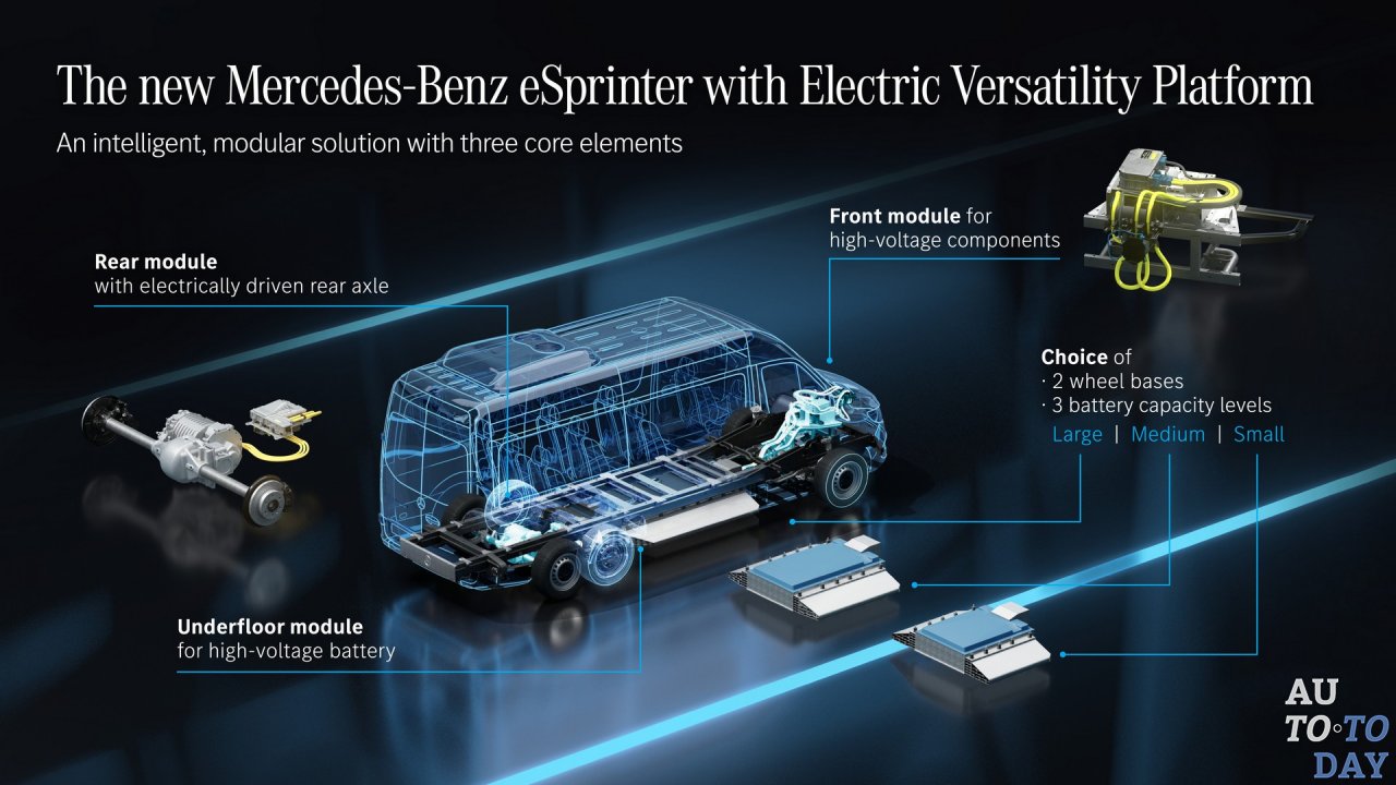 Как мы сообщали в прошлом году, eSprinter следующего поколения был ускорен и будет работать на новой платформе Electric Versatility Platform. Архитектура предлагает большую гибкость, и это позволит предлагать электрический фургон с двумя колесными базами и тремя различными аккумуляторными блоками. Все фургоны будут заднеприводными, и Mercedes подтвердила, что будет вариант шасси, который можно использовать для поддержки всего, от машин скорой помощи до автодомов.
