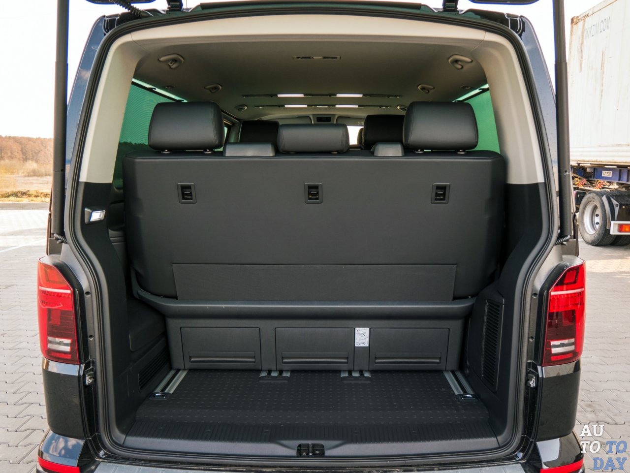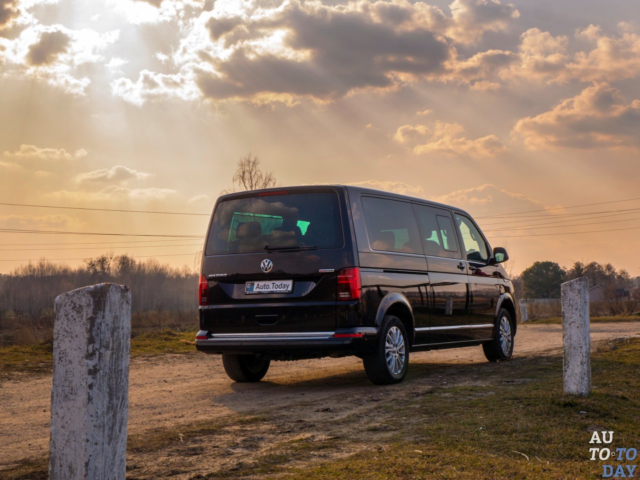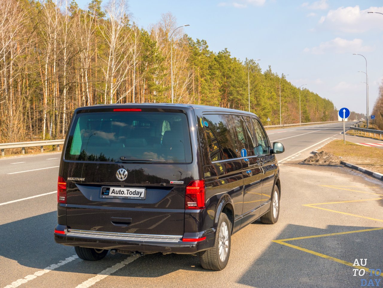 Задняя оптика также серьезно изменилась, но не своей формой, а наполнением. В зависимости от исполнения, фонари могут быть с лампами накаливания, или диодами. Как и полагается, обновление привнесло несколько новых вариантов колесных дисков и двухцветных вариантов окраски кузова. Но тестовый автомобиль выполнен в классическом для «Мультивана» черном цвете.