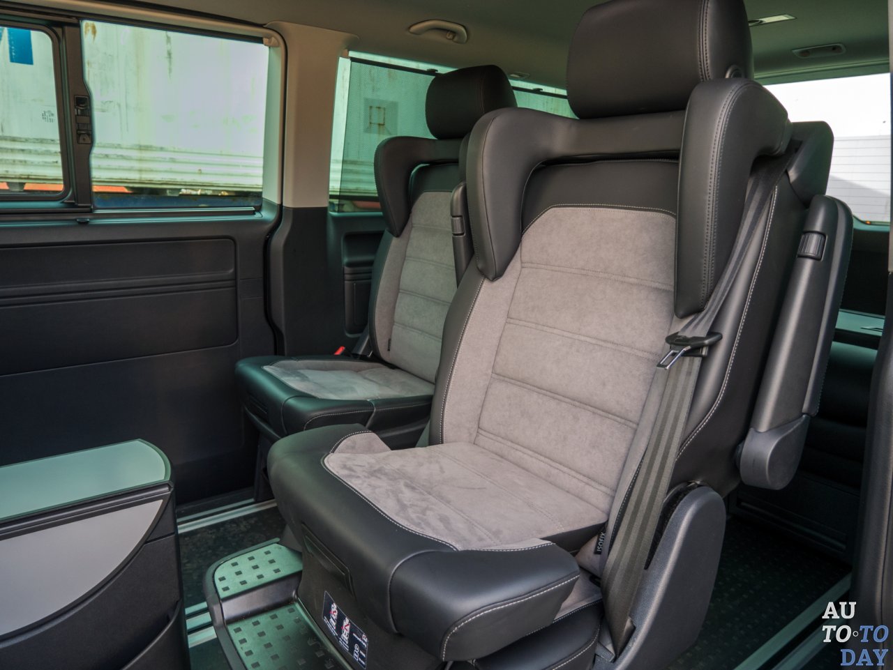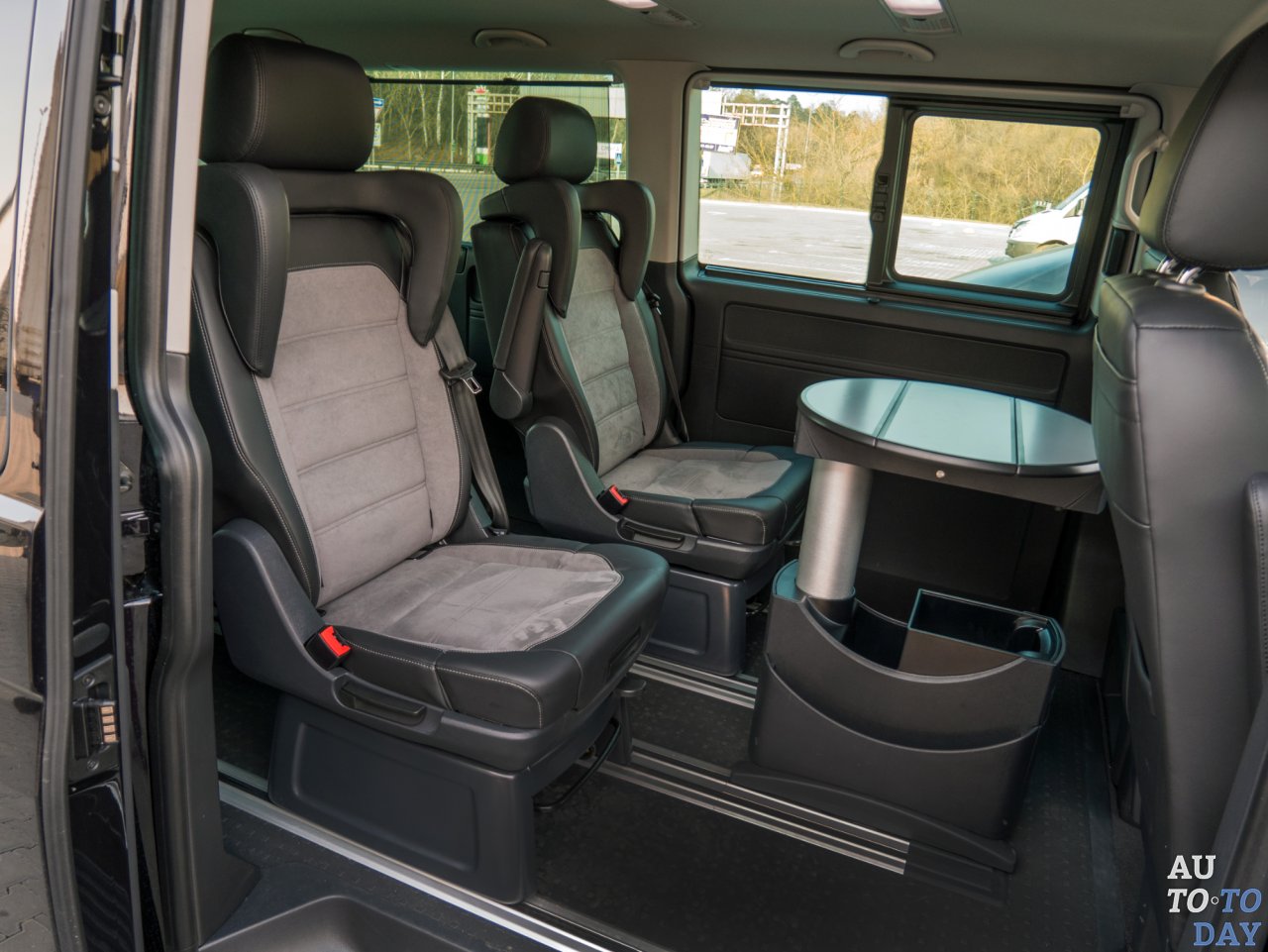 Тестовый автомобиль выполнен в длиннобазном варианте. Раньше для удлиненных версий «Мультивана» не было возможности заказать пару сдвижных боковых дверей, теперь же такая опция появилась. Как и ранее, двери открываются с трех мест: брелока, места водителя и со второго пассажирского ряда. Очень удобной для семейных путешествий показалась опция превращения пары центральных кресел в детские, достаточно лишь потянуть за рычажок и на подголовник установить фиксатор для шеи ребенка. Занимает такая операция всего две минуты, и получается, что кресла у тебя всегда с собой, не занимают лишнее место в салоне, или багажнике.