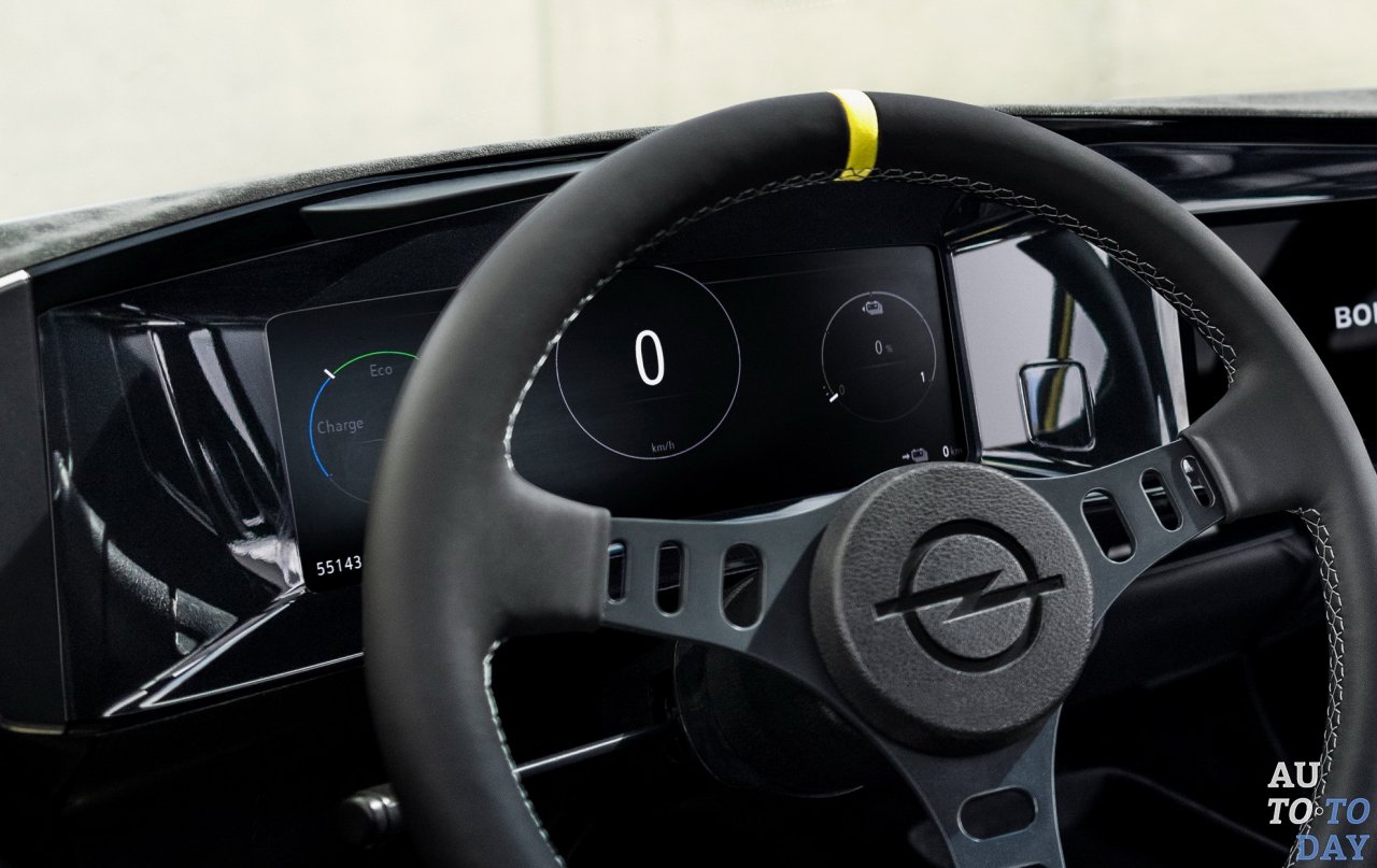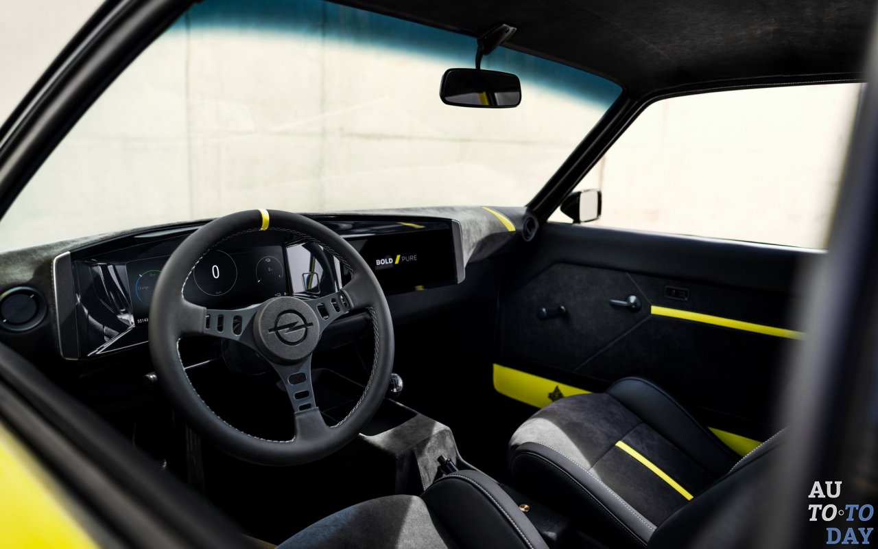 Электрический рестомод Opel также оснащен парой спортивных сидений с желтой центральной линией, которые обеспечивают гораздо лучшую поддержку и комфорт, чем оригинальные. Трехспицевое рулевое колесо Petri было переработано и теперь имеет желтый маркер в положении «12 часов», а поверхности приборной панели и дверных панелей теперь матово-серые, чтобы контрастировать с желтым и черным цветами, встречающимися в других местах.