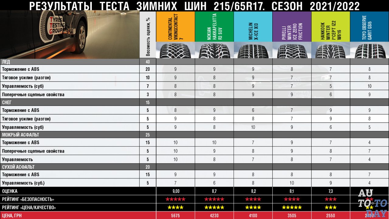 Более дешевые зимние шины для мягких зим центральной Европы значительно уступают перечисленным моделям в поведении на льду (при торможении, разгоне, маневрах и т.д.), а значит они более опасны. Что касается типоразмера 215/65R17 – то это СУВовский размер, который распространен в классе среднеразмерных паркетников.
