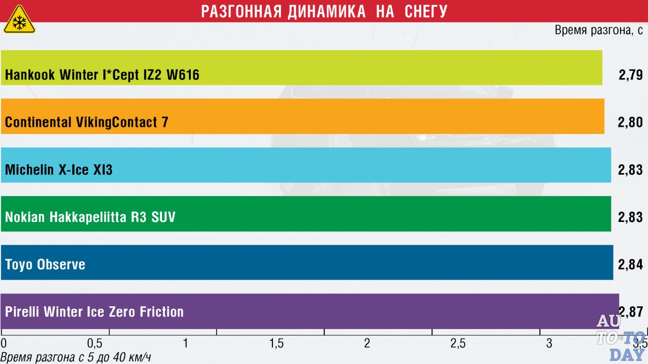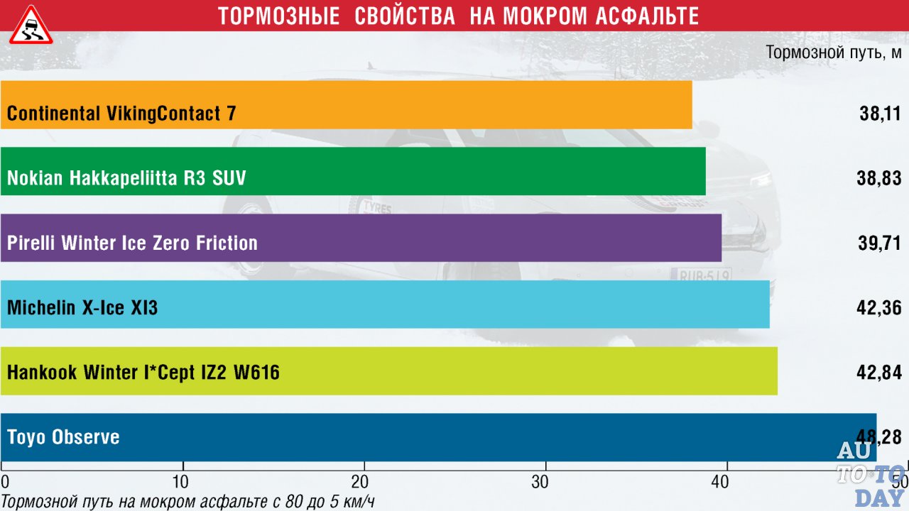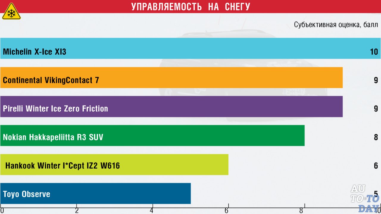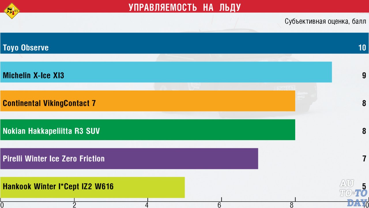 Аутсайдером нынешней группы шин, где нет бюджетных моделей, оказалась японская модель Toyo Observe Garit GSi5. У нее очень несбалансированные характеристики. Особенно слабой эта шина оказалась на мокром и сухом асфальте, да и на снегу управлять машиной в этих шинах – сложно. Создатели этой модели явно увлеклись свойствами шины при езде по льду и снегу и забыли уделить внимание асфальту. Эта модель также является самой тяжелой шиной в этом тесте, а эти в жизненных реалиям будет снижать ресурс подвески и увеличивать расход топлива
